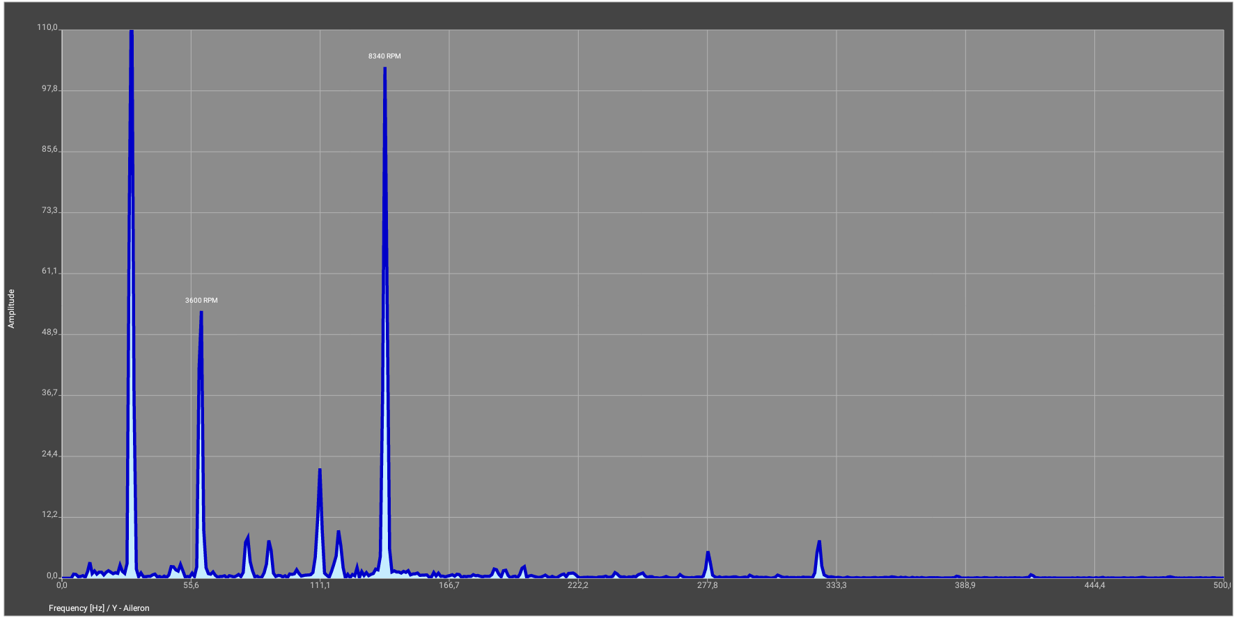 On Y axis at 1800 rpm I can see that high vibration that I suspect related to main blade balancing. But I also have a high level at 3600rpm and at 8340. This last one is the tail (ratio is 4.6 on this heli). But the one at 3600 I can't explain.