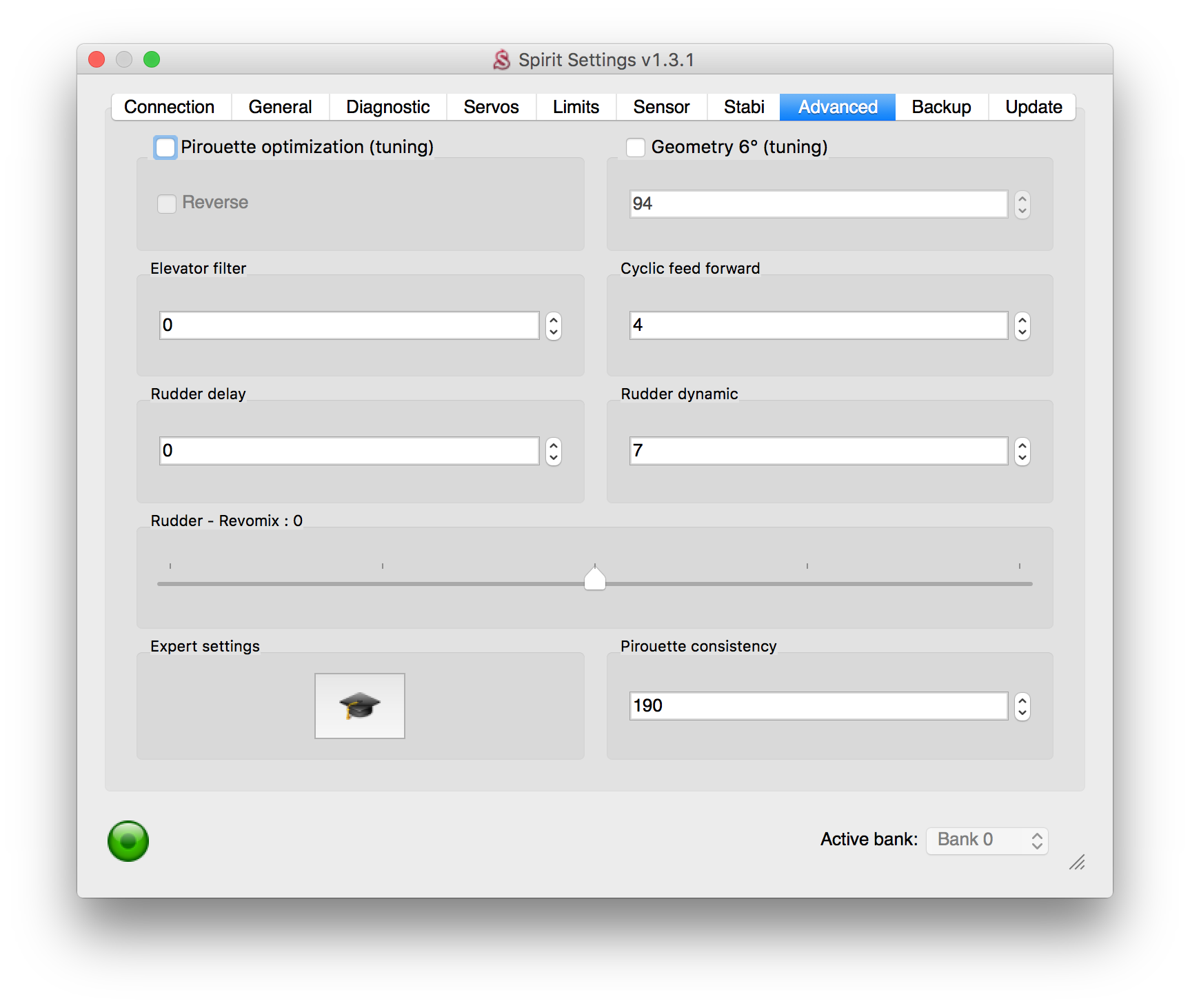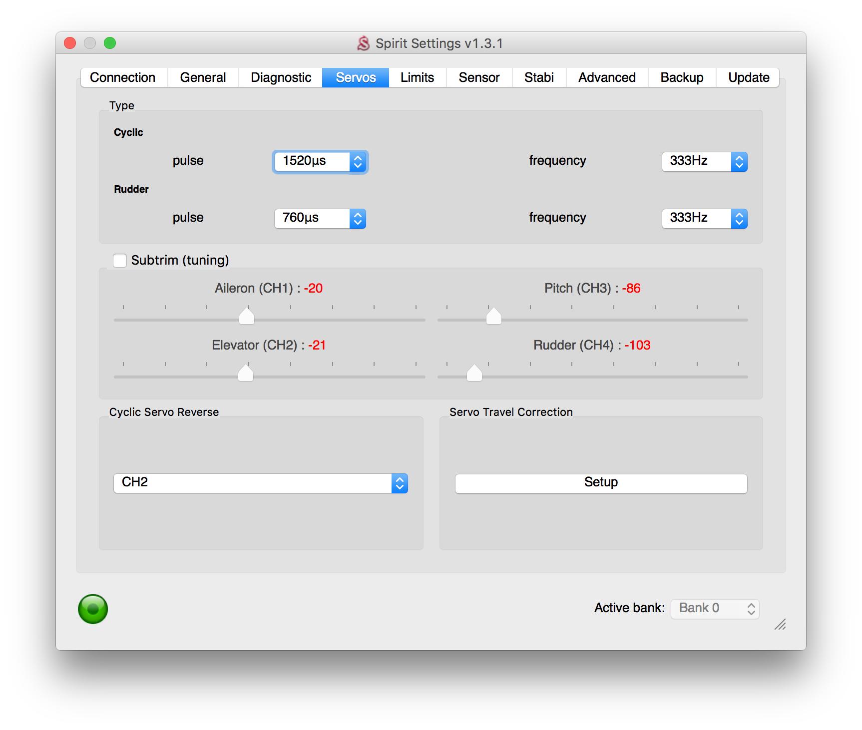 I have freed up the tail as much as possible, and put 115 tails on (with 696 mains). The bounce is no longer visible. I will need to revert to 106's and test again to see if I can get the same result by upping gain and/or rudder dynamic.