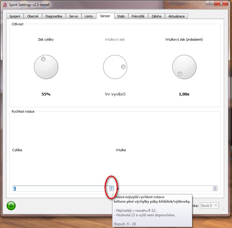 Rychlost rotace - při plné výchylce kniplu jak bude heli na dané osy rotovat rychle