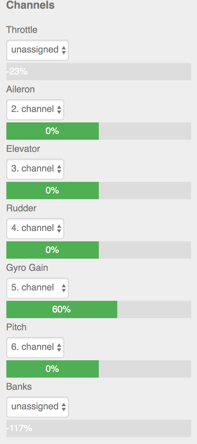 Graupner is saying the default channel map is that Channel 1 is collective and Channel 6 is throttle. They are saying I should change the channel assignment in the Spirit. The default channel assignment is:
