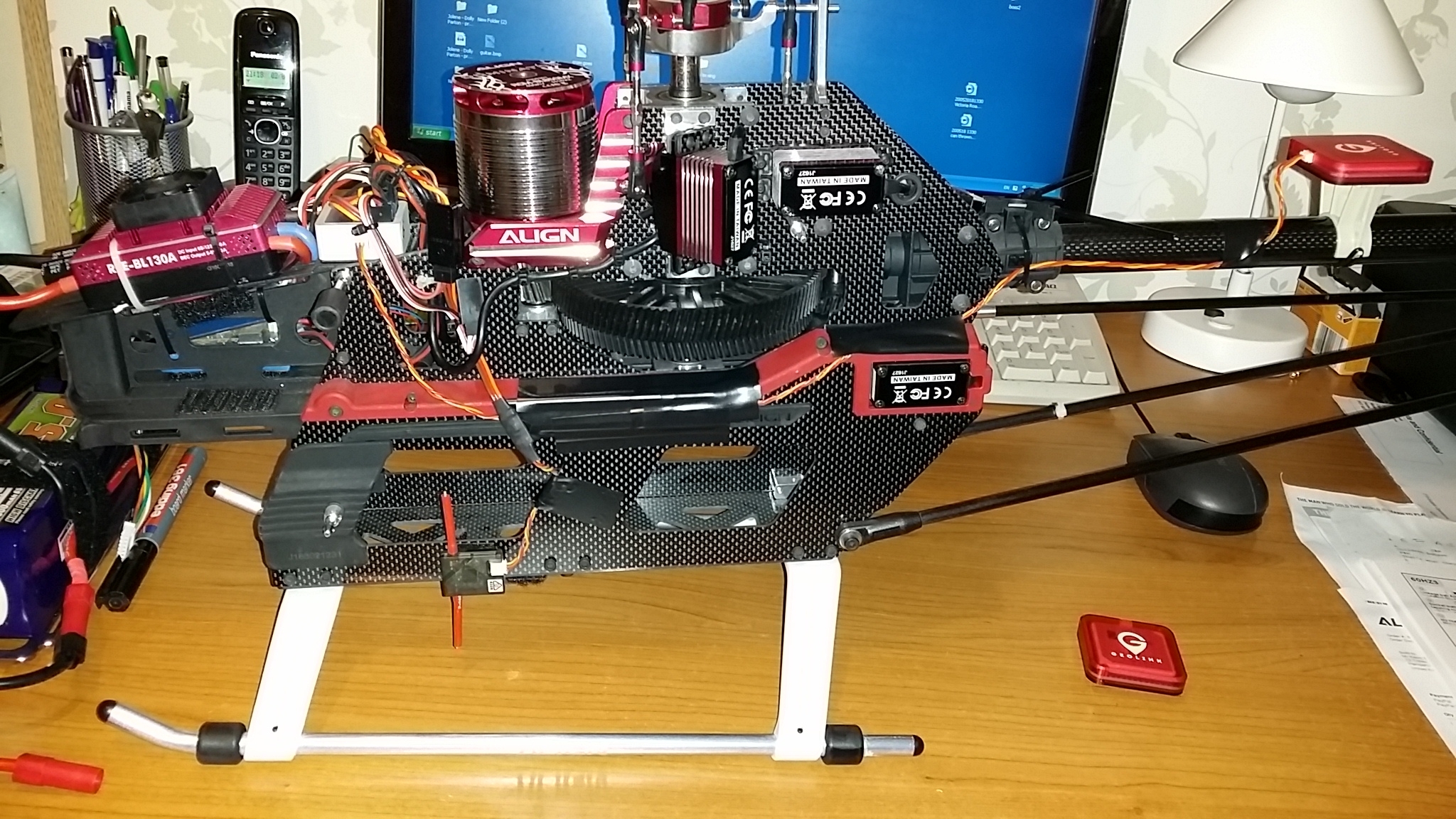 I received your longer cable and decided to try my second geolink on my trex 700x. I tried to route the cable as far away from anything electrical as possible and have used tape to hold the cable in place.