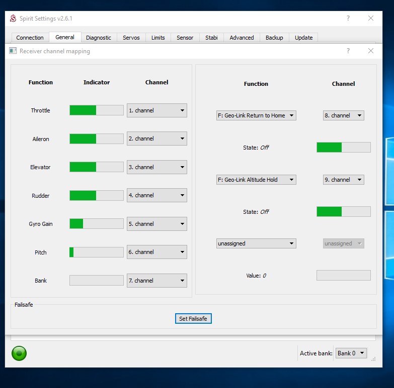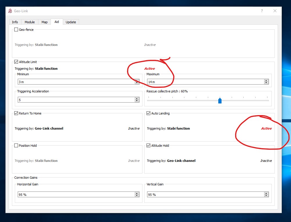 Hi, I have just updated to 2.6.1 and I am aware that the stabi and geolink settings need to be reset. So I have Altitude Limit on a switch (CH8) and RTH and Auto landing both on another switch (CH9) . However please look at my screenshots as I am a bit confused as to what is going on. I have RTH on channel 8 and Altitude hold on channel 9. Now with both switches in the off position, I get these odd results in geolink aid page. Can someone explain why altitude limit and Auto land are "active" Might be me being stupid but I didn't have any issues prior to 2.6.1. By the way, I'm using open TX without integration. Thanks in advance
