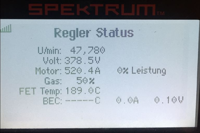 Voltage 378 V RPM 47,780. Throttle 50% is korrekt. In Spirit i set ESC Telemtry to "Kontronik & Jive Pro", and Motor settings in Spirit Software.