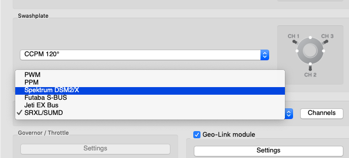 Now you are ready to power up the unit. If your Power supply is not connected yet, we recommend to connect it to the AUX1, AUX2 and/or CH0 port. Before you can utilize the Spektrum integration connection, it is important to set the Spektrum DSM2/X receiver type in the General tab of the software. Please start the Spirit Settings and change the receiver type as displayed on the photo. Then save the settings (e.g. by CTRL+S) or the Backup tab/Unit - Save and restart the unit