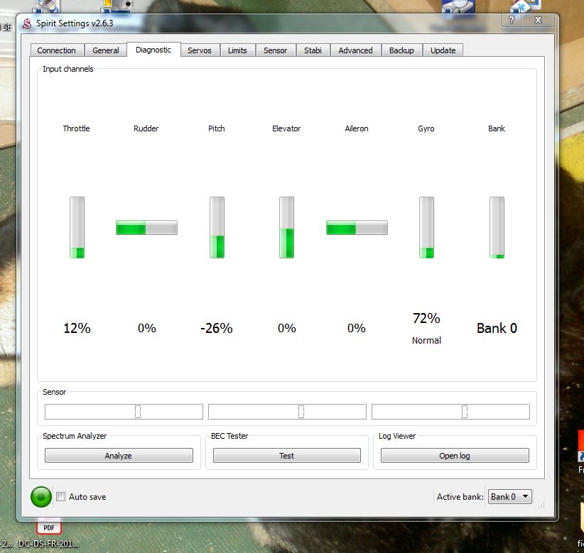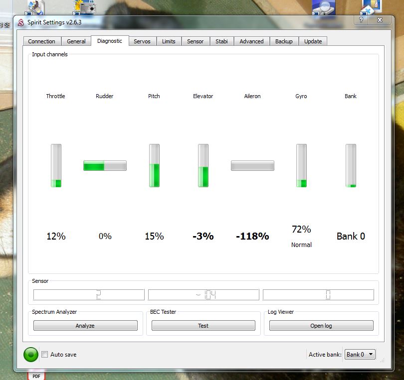 Could you please verify Servo monitor in your radio? Is Aileron channel in the middle (0%) when problem occur? Or is it showing same problem as in Diagnostic tab of the Spirit Settings?