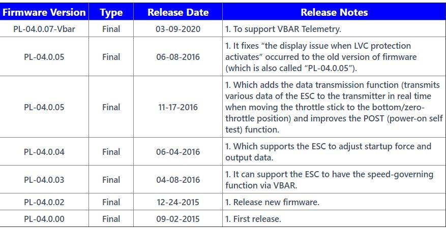 Hobbywing Company writes the manuals with his feet, and in the history of the revision of the updates the current version(my esc 60 amp v4) before the Vbar is also missing, that is the 04 00 6(see Attachment)