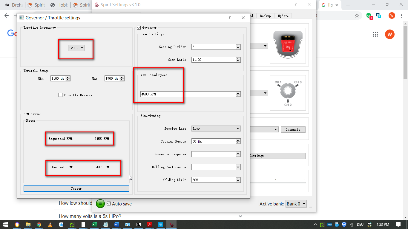You have to choose based on what head speed you want. If you want to have 3,200 rpms in the radio set 80 80 80 80 and in the spirit max 4,000. This is an example.