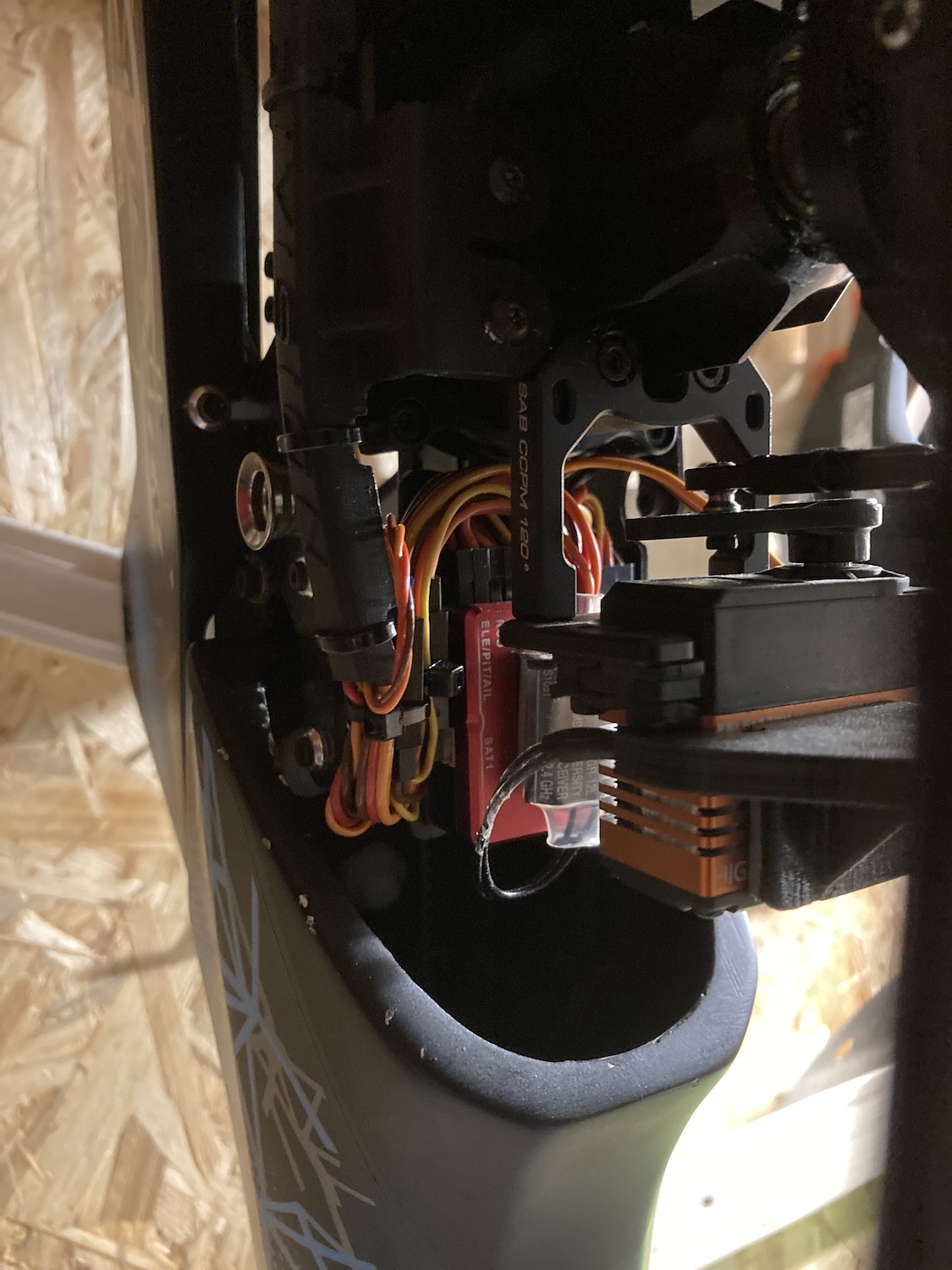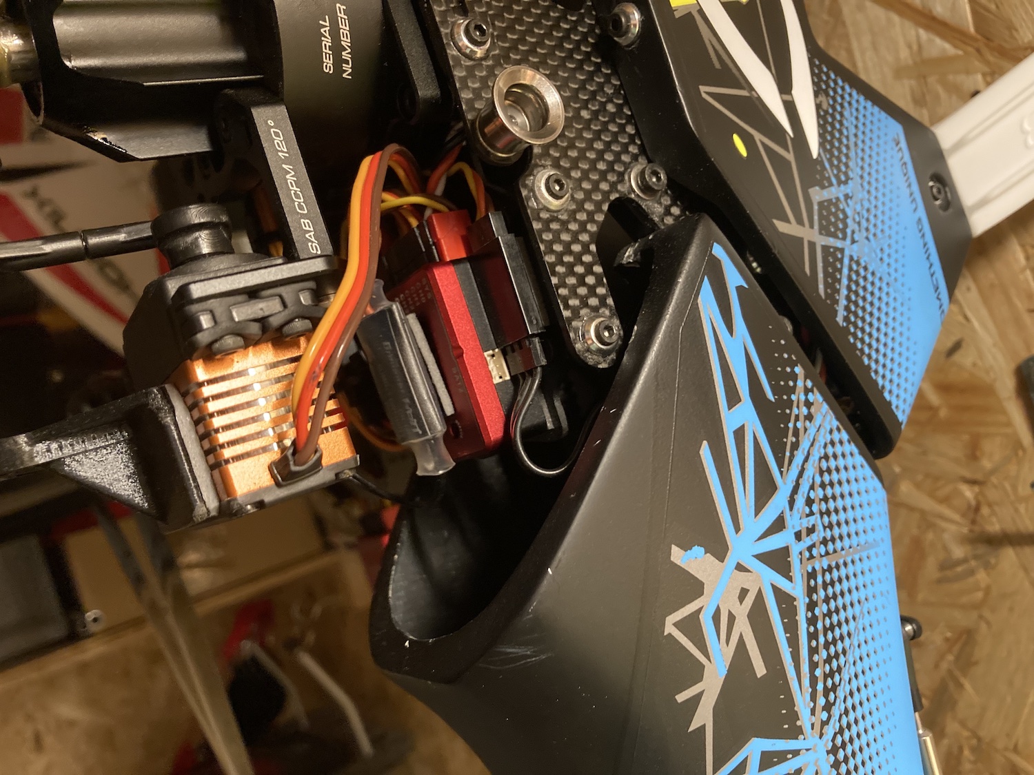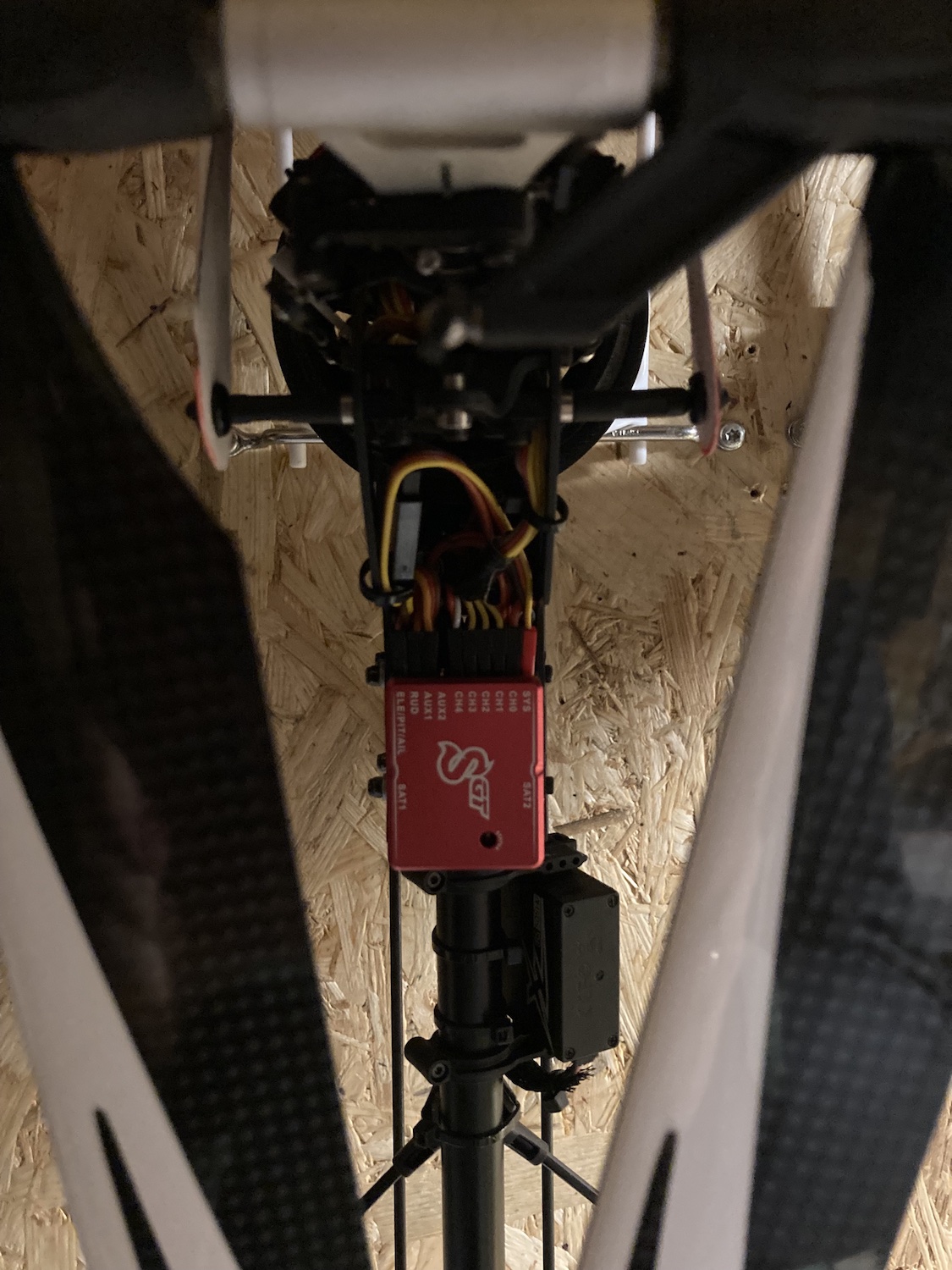 In both cases the Spirit unit is mounted with the plugs showing to the front. I used the original tape. I was very precise while setting the swashplate.