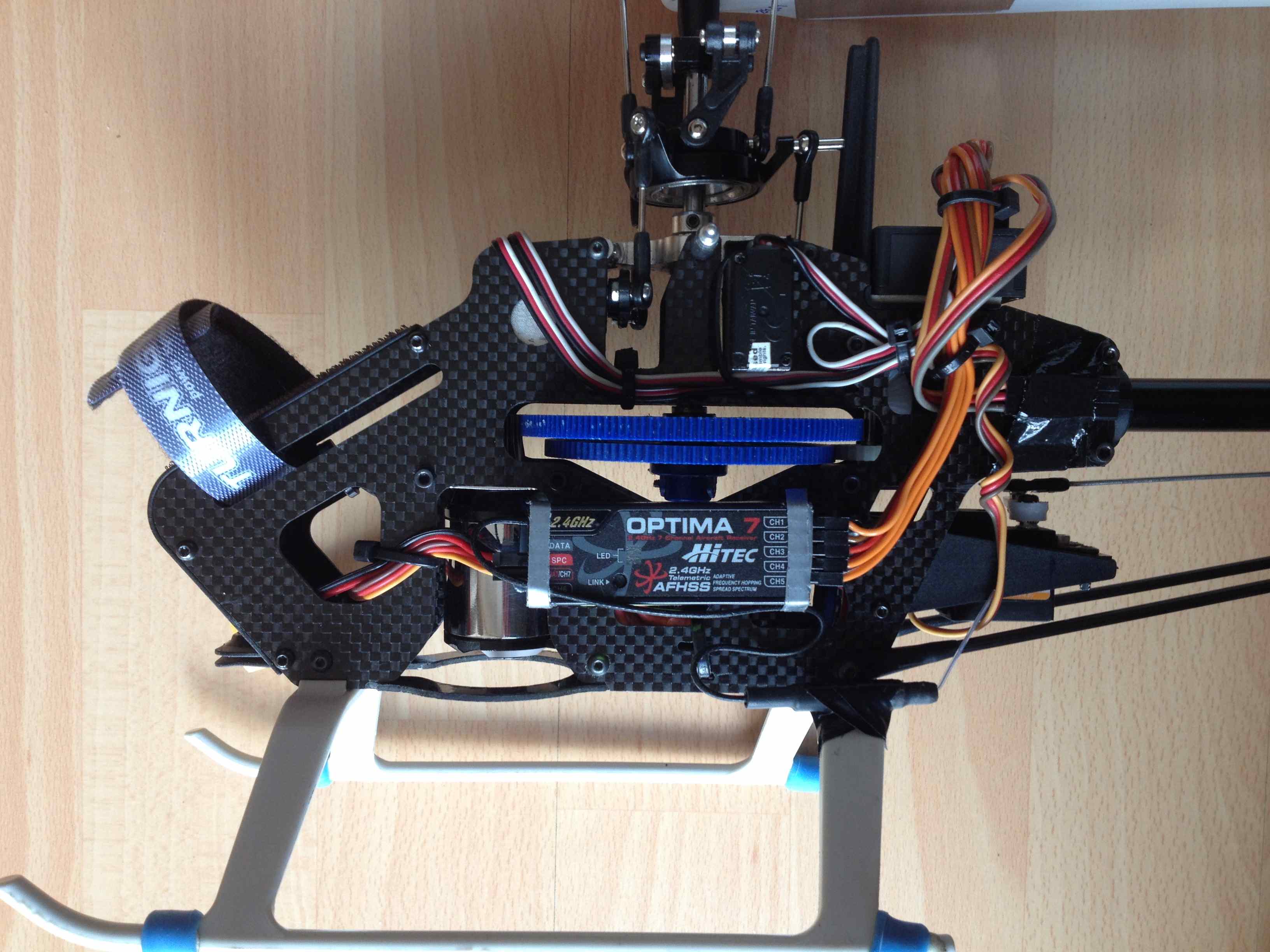 Tak pomalu zapojuji mého T-Rexe 450. Přijímač Optima7, a pořád mi to vychází bez toho, abych musel jakýkoliv kablík rozdvojovat nebo nastavovat: