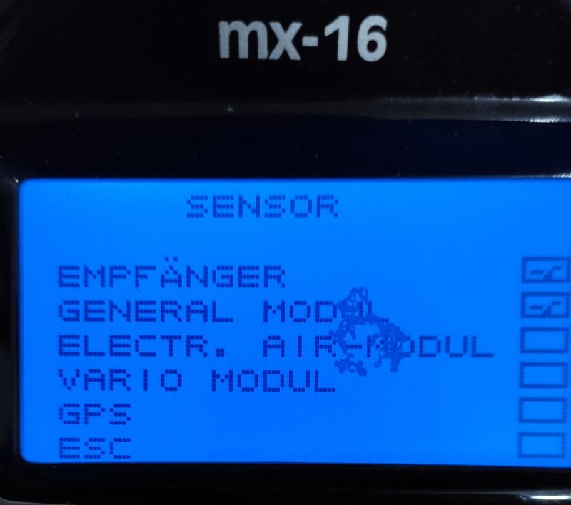 Hello Michael, thanks for your quick tip. I have already discovered the instructions you mentioned and tried to follow them. Unfortunately I can't get any further. It seems that the “general module” is recognized as shown in the picture. But now I can't get any further. I also can’t find the “option SENSOR at Chx” setting. However, this setting probably only applies to the GR-12 receiver. I have GR-16 where SUMD is set to CH8. Maybe you have a tip from your experience with GR-16 and Sprit GT? Thanks in advance. Dieter