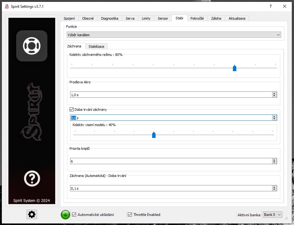 Banky k aktivaci Záchrany ani Stabi nejsou potřeba, pokud v záložce Obecné/Kanály si nastavíš jednotivé funkce na různé kanály a v záložce Stabi u Funce budeš mít poslední položku Výběr kanálem.