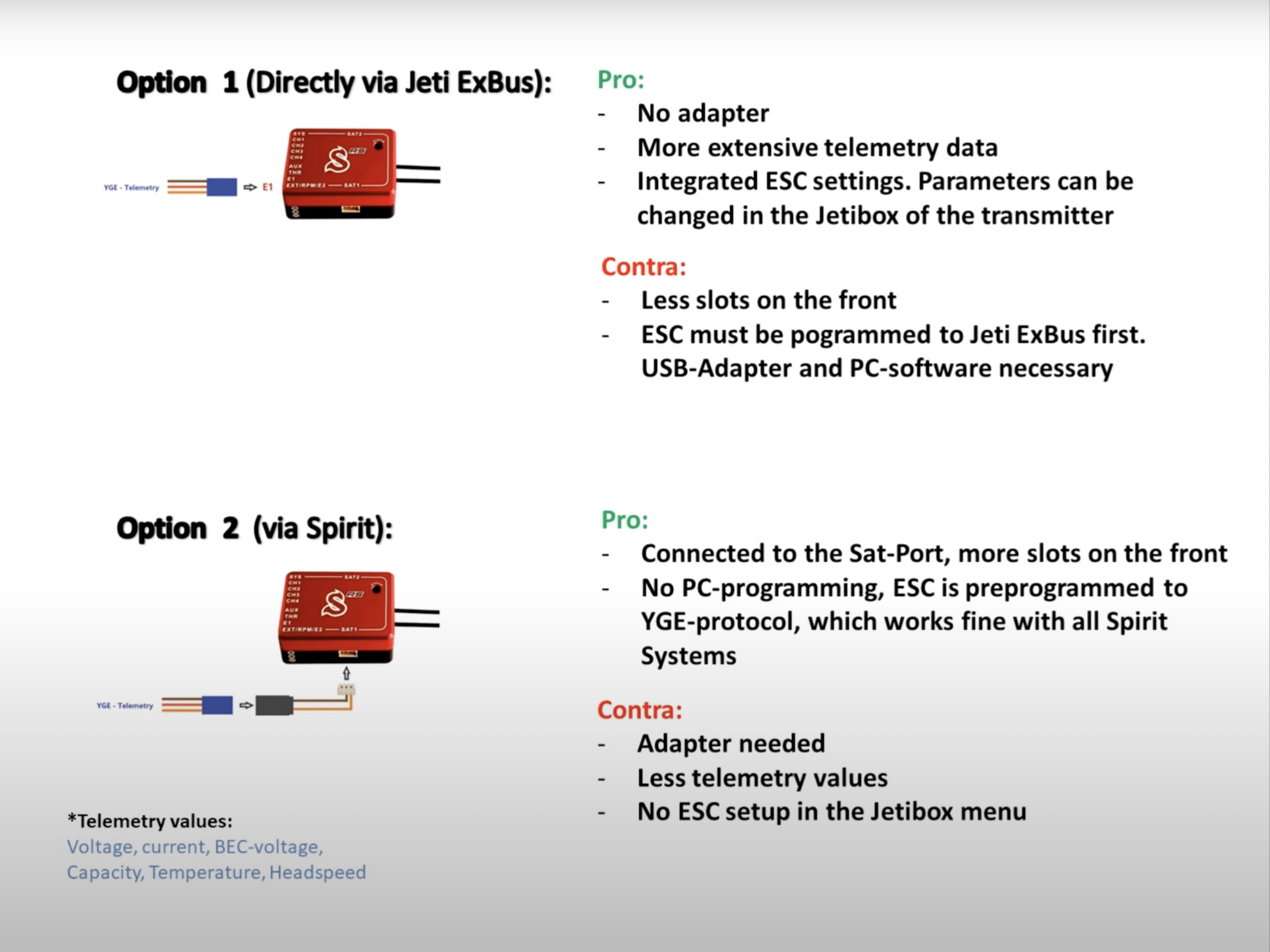 When using a YGE ESC with a Spirit W1 flight controller and WAVE radio, should the YGE ESC telemetry wire be connected to the T1 port or one of the 2 SAT ports?