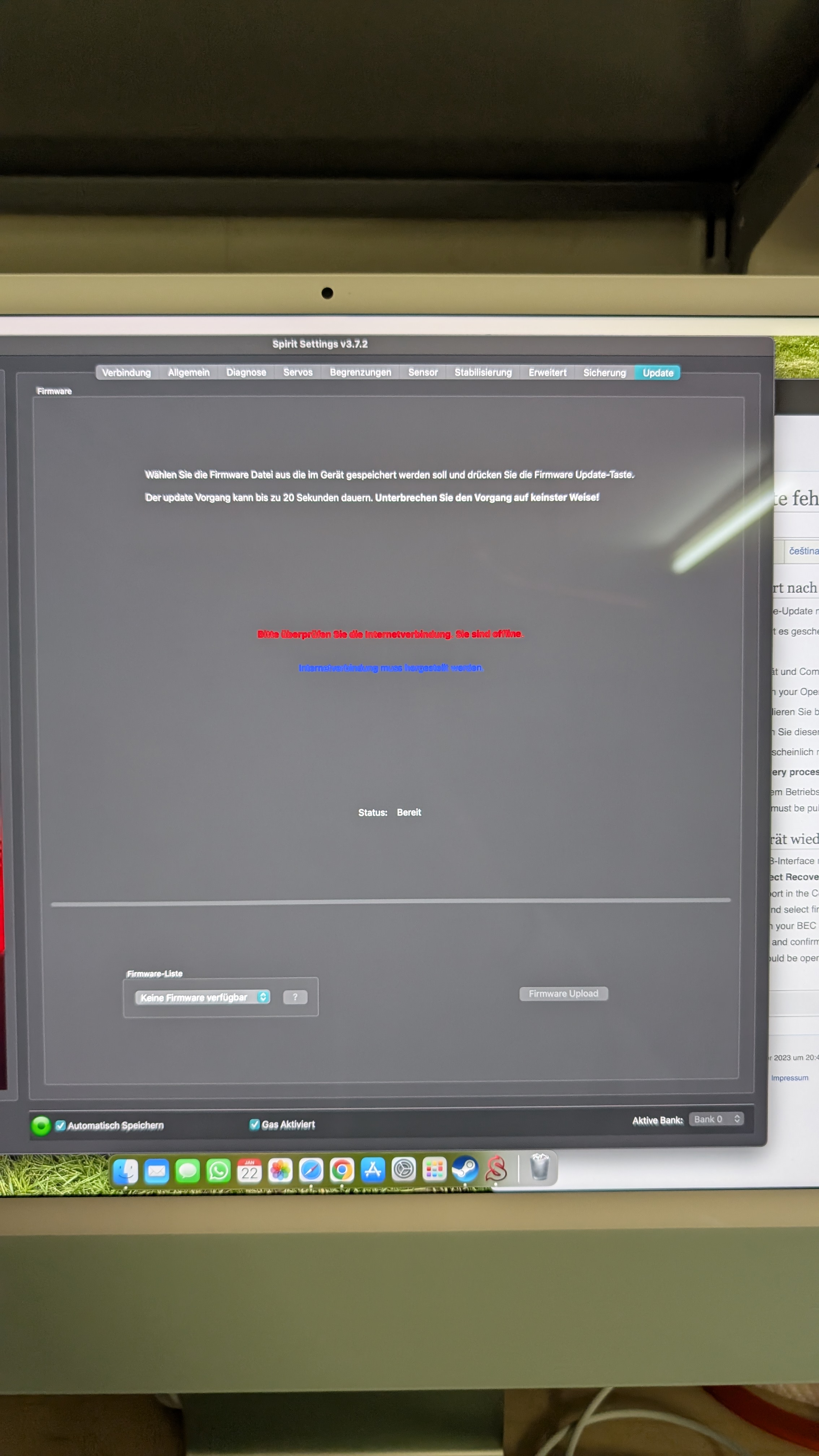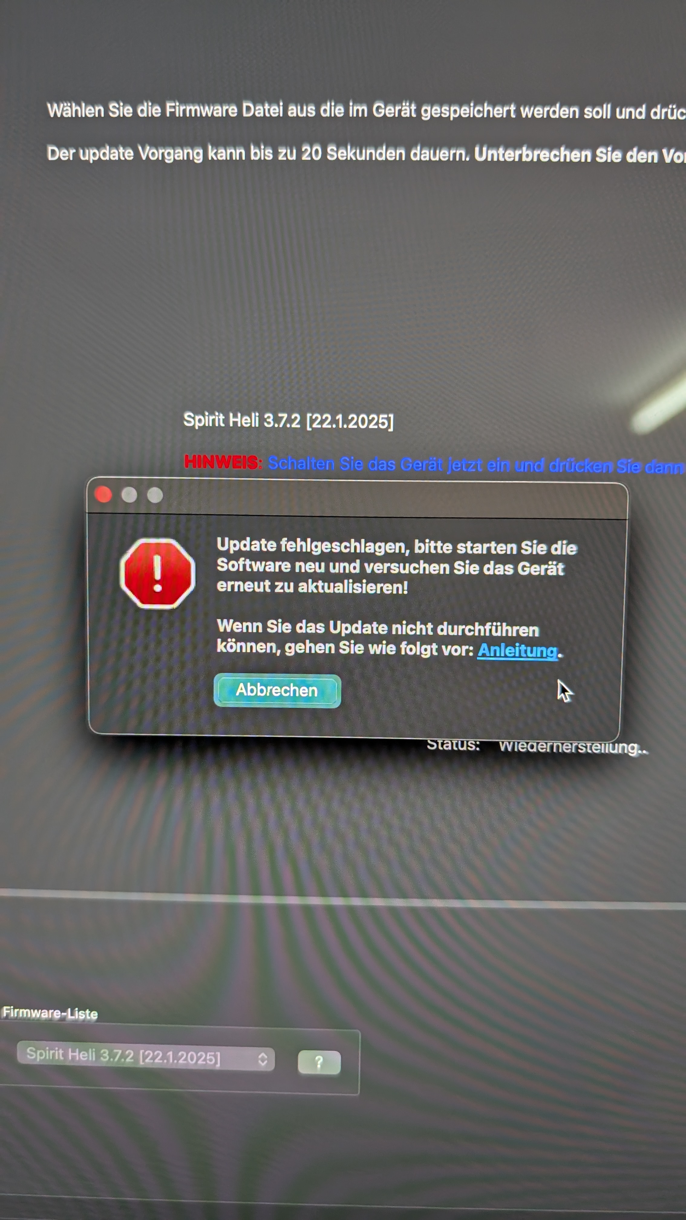 This evening I wanted to install the new 3.7.2 on my W1 via the Wave. So I thought at first I would do the RX update from version 3 to 4, after the update the heli restarted and I no longer have a connection. Afterwards I tried to update the software via the PC and Mac. When the heli is connected to software, the W1 is recognized but no firmware is available under Update.When I try to make a recovery, after booting I select the correct USB after update Plug in the battery but the W1 simply lights up blue and doesn't start pulsing. I waited 5 minutes nothing, then just pressed the update. Logically error. The W1 with a binding plug is bound by the wave, but no RX reports. I'm asking for help I made 3 models via wave update today, but there's a worm in one