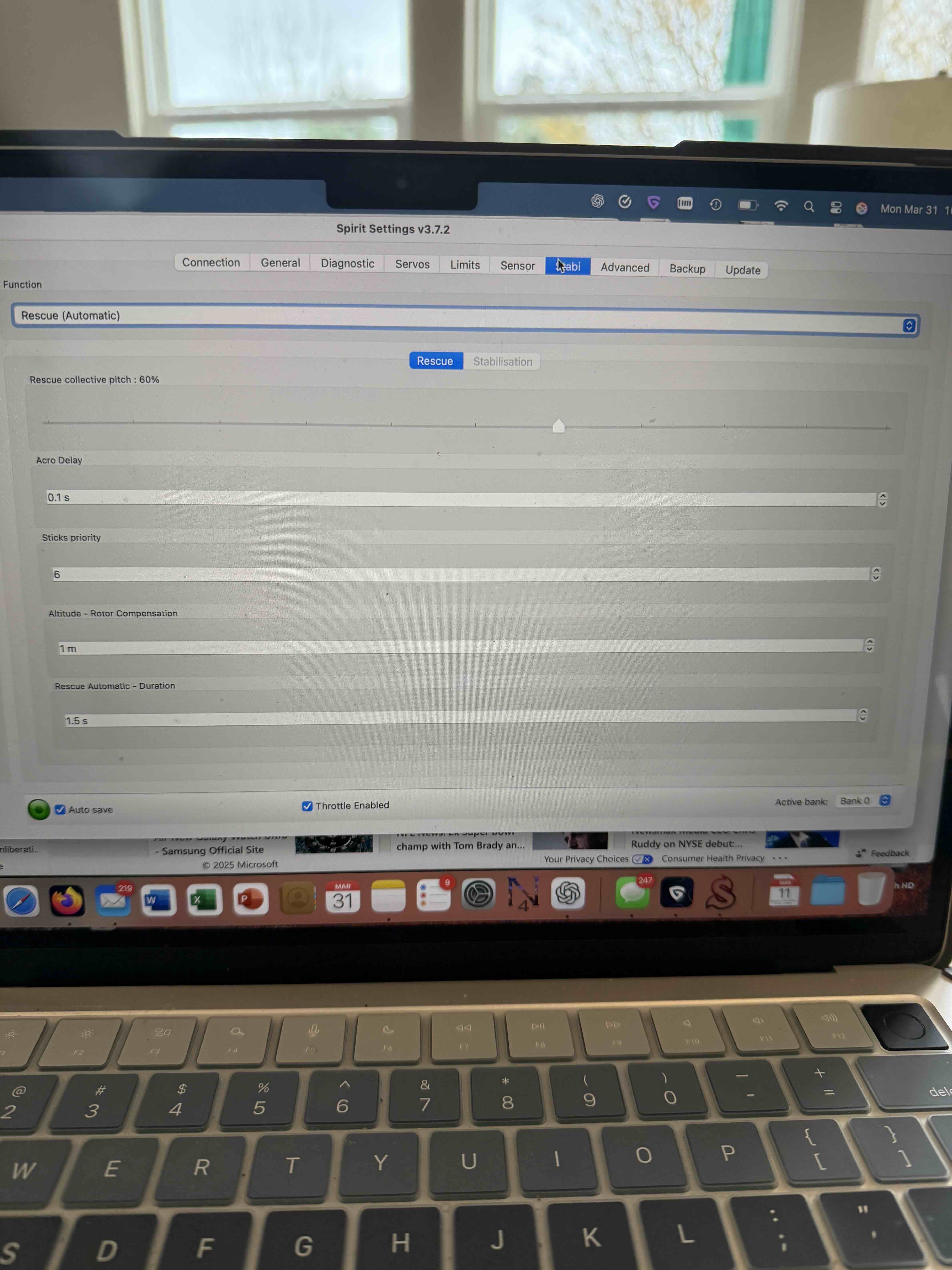 On the other hand if you set stabi function to Rescue (Automatic) in the stabi tab as you initially had, that's the only stabi function you can use and you must activate it by assigning a channel to F: Stabi Function instead. In my opinion this option should be clearly marked as deprecated, it's there for legacy support of units still configured this way but there's no point in doing it and it's confusing to a lot of people.