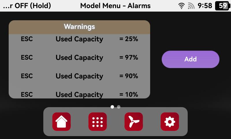 For the actual flying helicopter models, I set up capacity consumption warnings similarly to how VBC does it. However, instead of using 10% increments like VBC does, I personalized the warnings in a way that works better for me. I set up the warnings to 90% remaining, 75% remaining, 50%, 25%, 10%, 3%, and 0% remaining. I prefer this warning method better than VBC because I get fewer warnings (7 warnings instead of 10), and I get the 3% remaining capacity warning which is my cue to do an auto-rotation at end the flight. (see attached picture).
