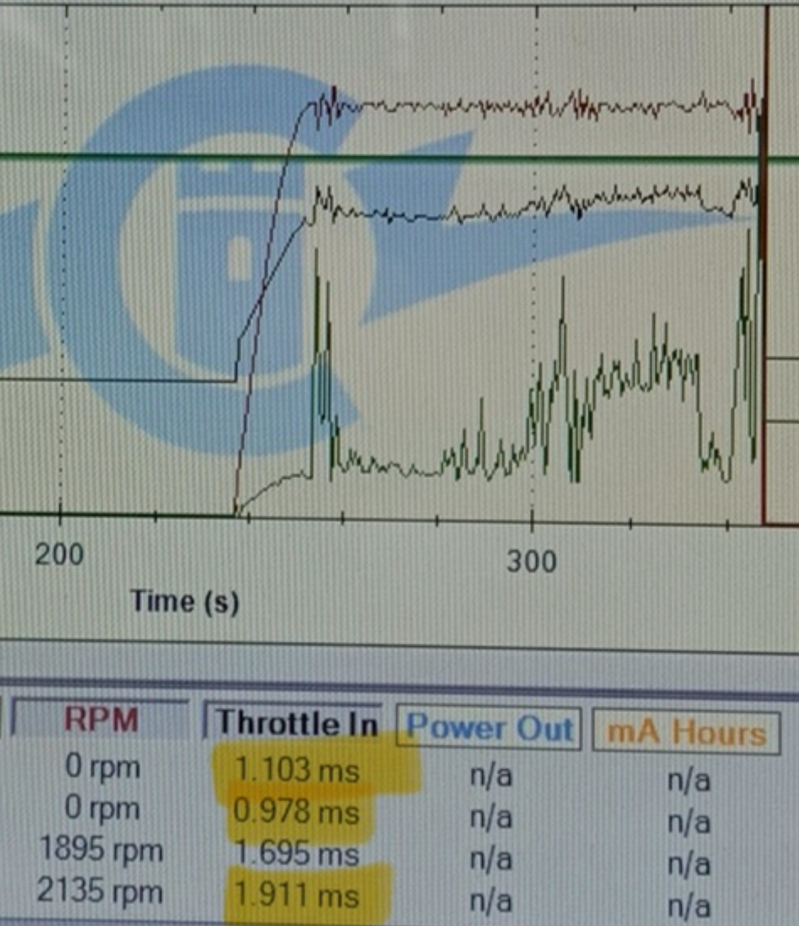 Spirit GT and Align ESC. <br />Grey is RPM and blue is Throttle out.