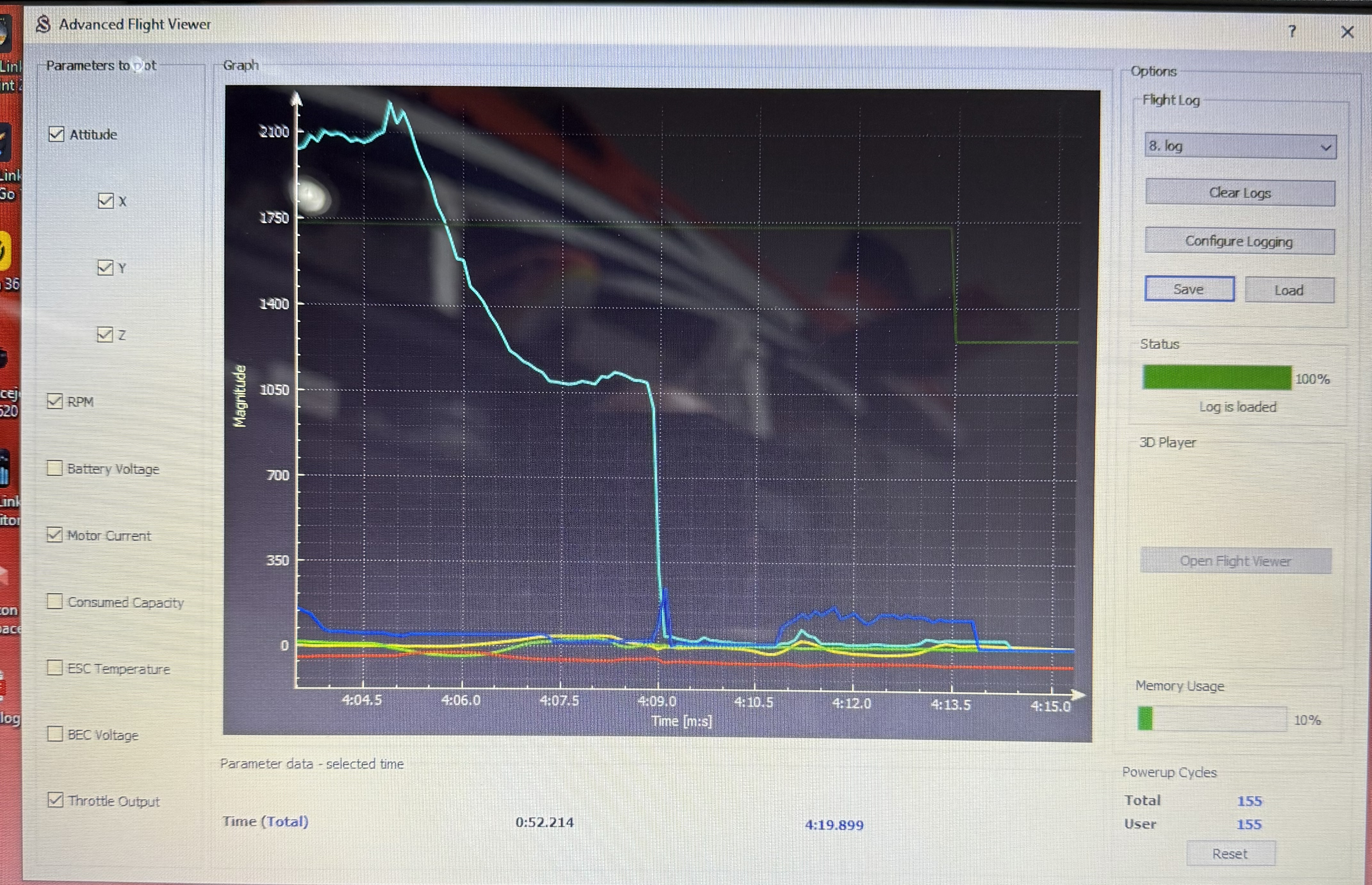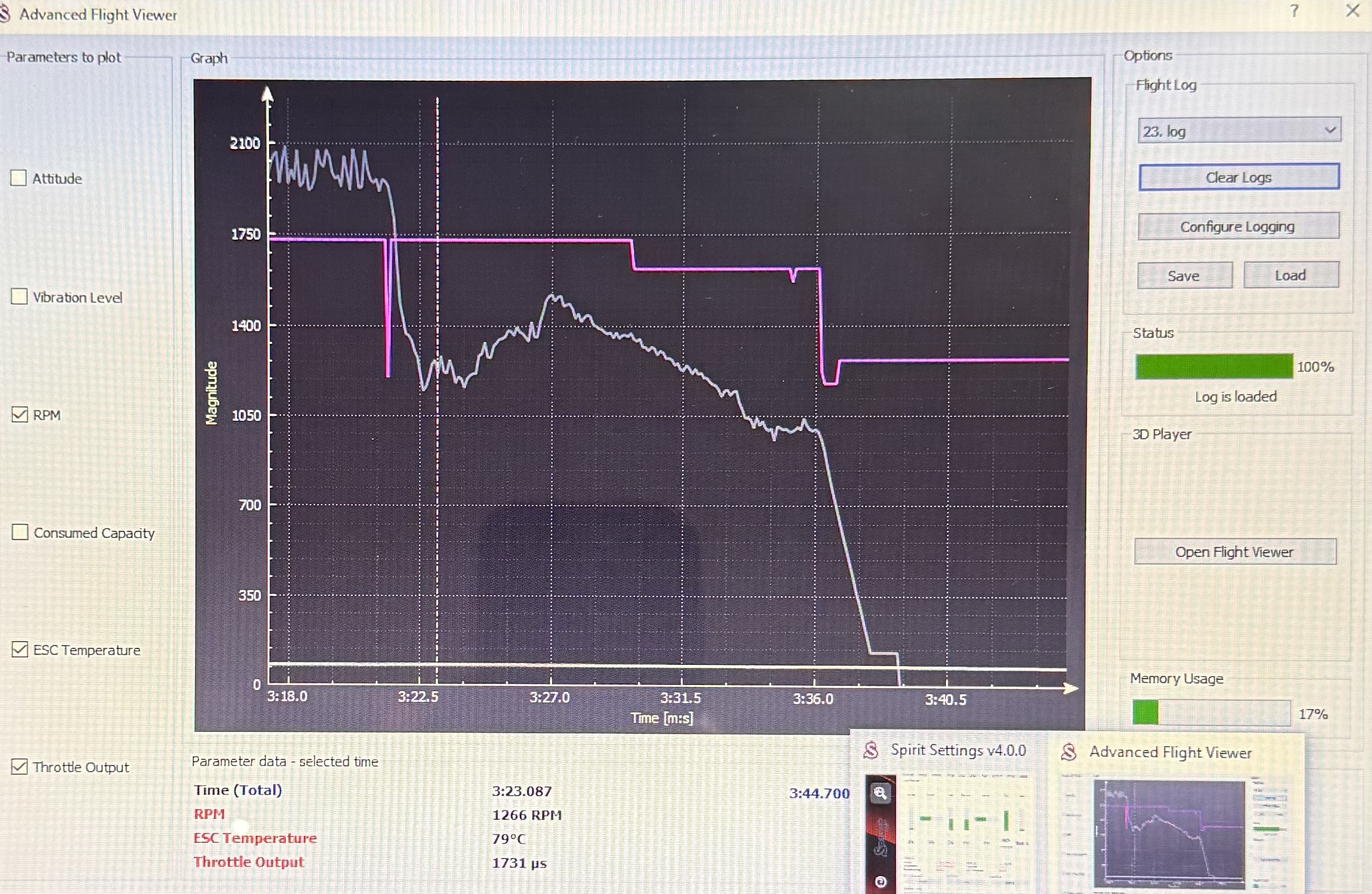 Attached is a log chart in the V4.0 Flight Viewer that shows the RPM and Throttle Output. Before the head speed drop, there is a glitch that reaches a very low throttle output. Another smaller glitch is seen too.