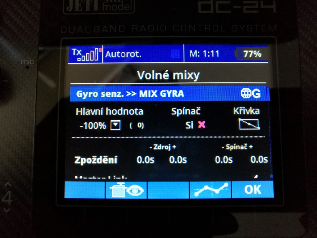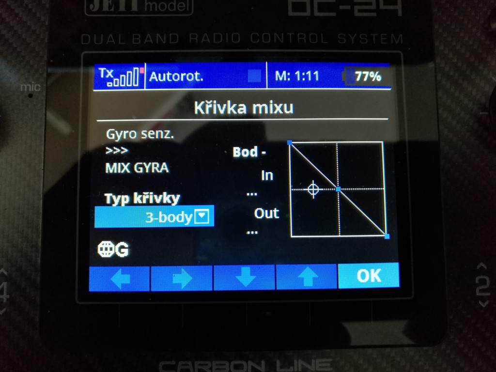 Třeba to ještě nekomu pomůže... Letové režimy mám nastaveny jak jsem zvyklej, včetně gyra pro každý letový režim jinak (používám HOLD, NORMAL, IDLE1,IDLE2 a IDLE3). Nejdříve jsem si založil novou funkci, která se jmenuje např. MIX GYRA. Není ovládána spínačem, ani trimem. Ve volných mixech si udělám dva globální mixy, které mají oba shodně jako "Master" nastaven "Gyro senz.", jako "Slave" novou funkci "MIX GYRA". První mix (záchranný) hlavní hodnota -100%; ovládaný vratnou páčkou Si v horní poloze; křivka 3 body: +100 0 -100; Master link - ; slave trim +; Trim a dual rate neaktivní. Druhý mix (bez záchrany aktivní mimo záchranu); hlavni hodnota 100%; ovládaný Si v dolní poloze (aretována pružinou); křivka 3 body: +100 0 -100; Master link - ; slave trim +; Trim a dual rate neaktivní. V přiřazení serv mám na kanál 6 MIX GYRA místo Gyro senz. !! (Gyro senz. mám na 10. kanálu) Mixy kopírují hodnoty z funkce Gyro senz. do funkce MIX GYRA. Jeden do části HL, druhý do rozsahu zachrany. Funguje pro všechny režimy, včetne trimů, ladění a pod. v nastaveních funkce Gyro senz. Kdyby něco, klidně pište do SZ