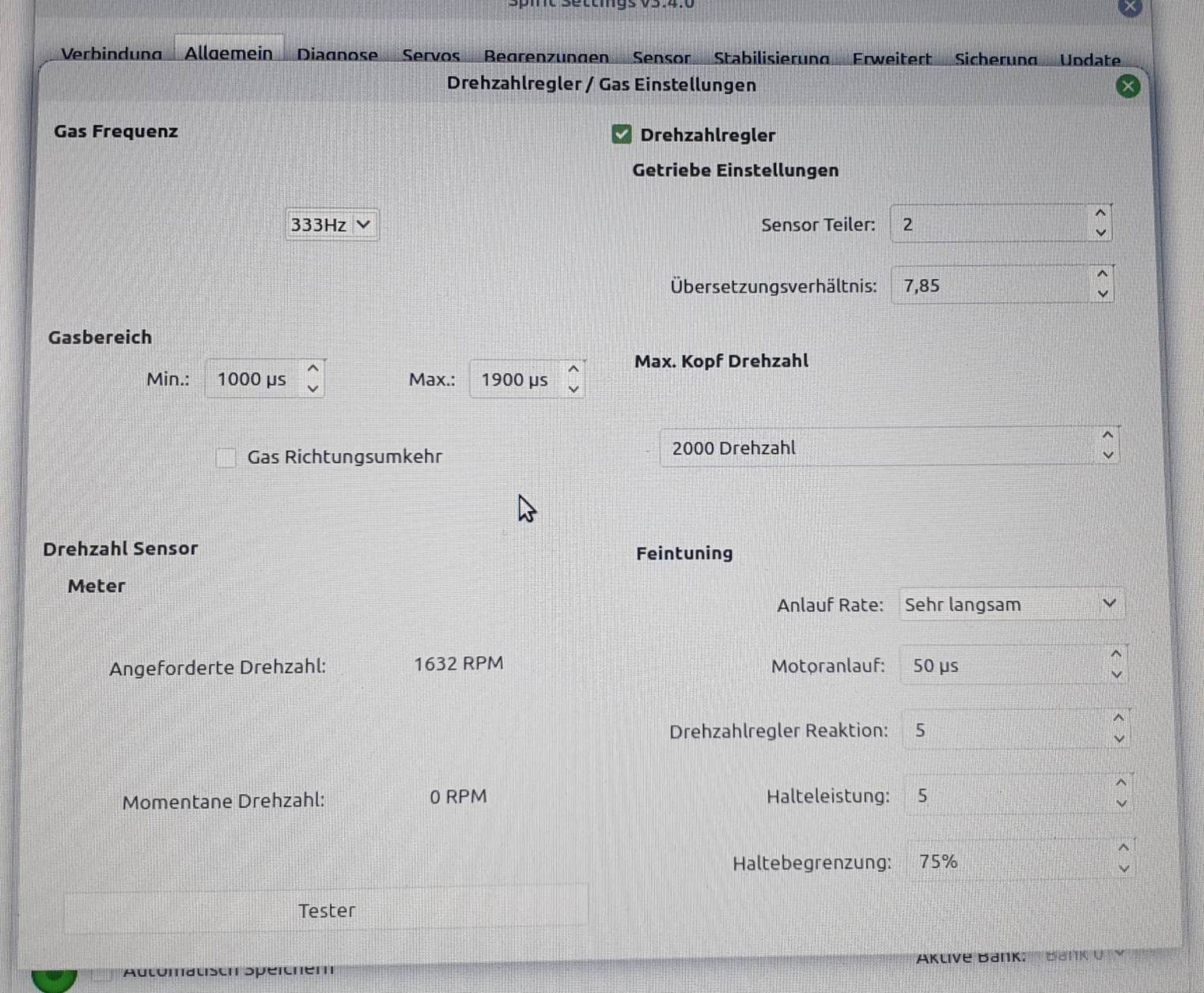 Under General, Speed governor / Throttle. There you will find the test button at the bottom, where you can check that it changes from active to inactive. If this works, you can set the speed on the actual page. You do this via a throttle line. You will then see that the controller wants to maintain a speed of 1700 with a straight line of 80% and 1950 with 90%.