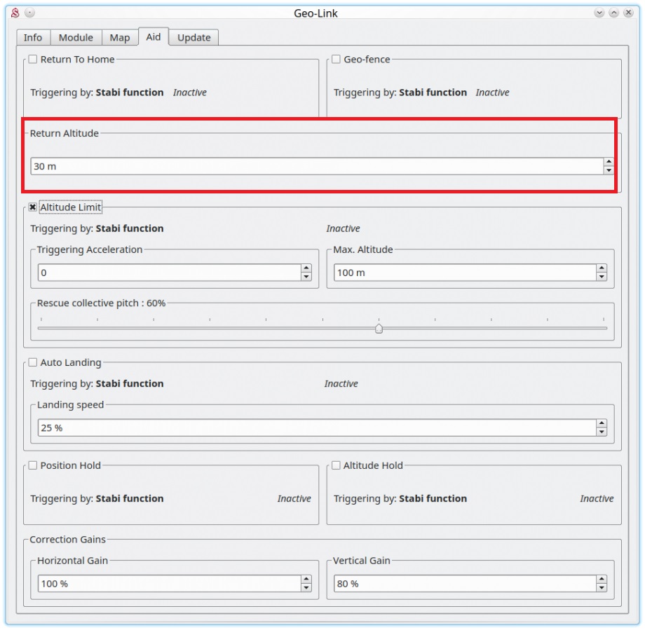To engage with assigned GeoLink channel - it is required to assign F: GeoLink Altitude Limit function in the General/Channels to an available channel. [EASIER TO SET UP]