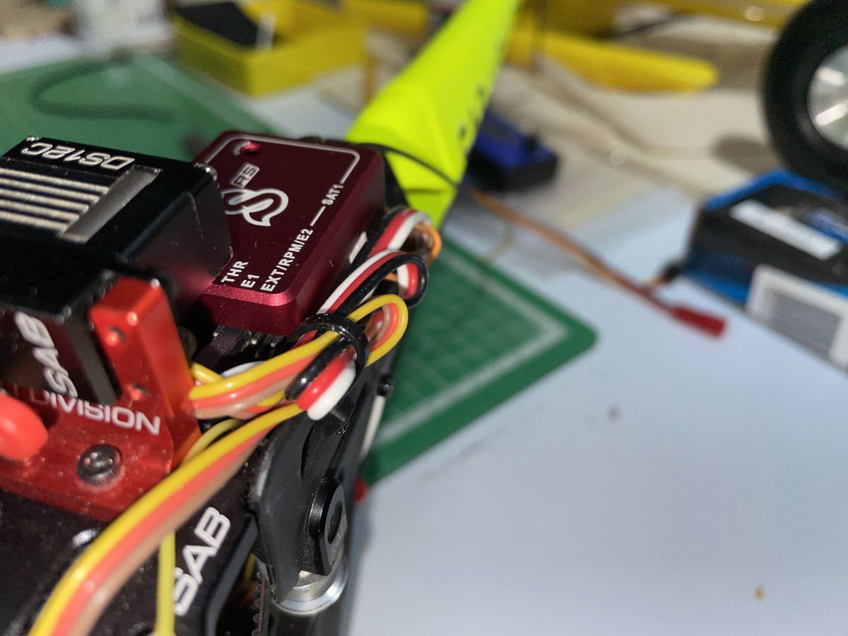I made another picture from the front, so you can see the connections. As you can see nothing connected to E1 and E1. Then THR connected to the ESC and AUX not connected.ZeXx86 wrote: I can see that there is something connected to EXT/RPM/E2 - there are white, red and black wires.