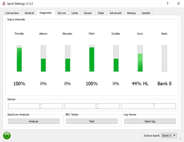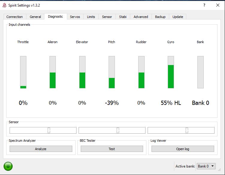 All the above test was done using a JR xg14 TX with a JR RG731BX receiver. The receiver is connected with the xbus cable to the rudder port on the spirit unit. The Tx is set on xbus mode B and the ESC is connected directly to the spirit unit in the aux1 port. With this radios/receiver setup, the PPM port are disable when the tx is set on xbus mode B, so I do not have the choice to connected the esc directly to the spirit pro.