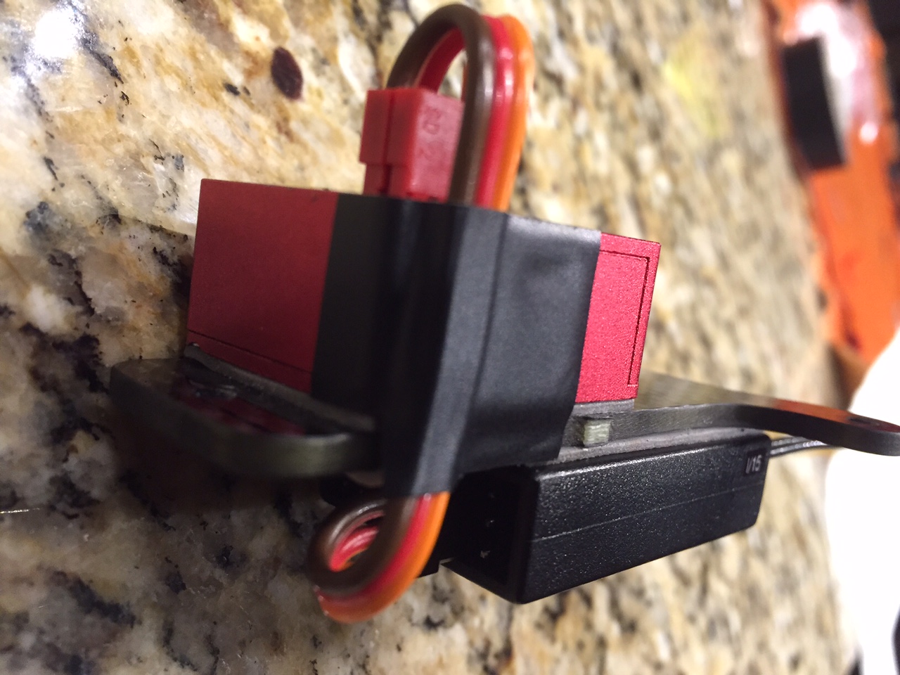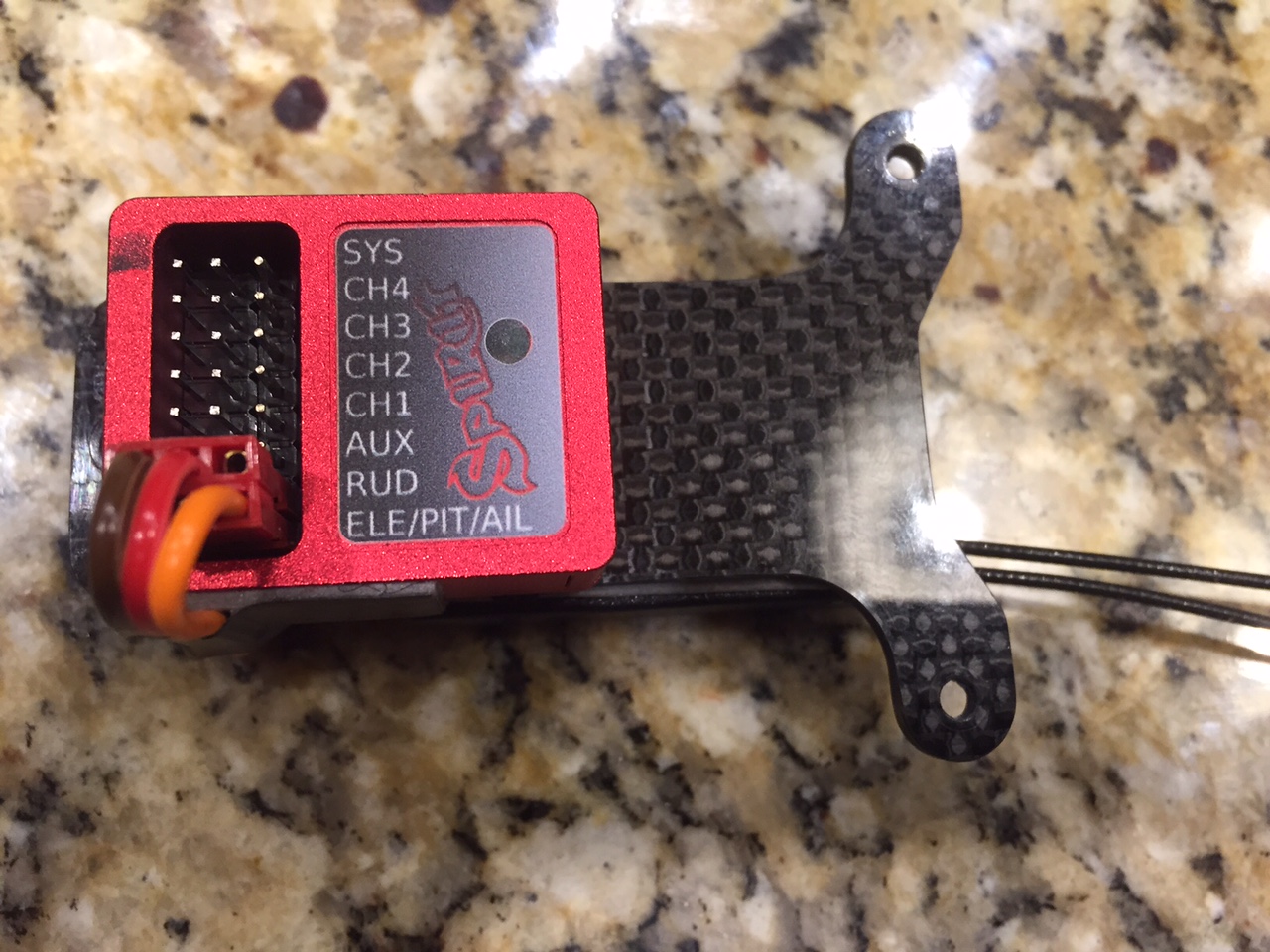 In these pics, you can also see how I used the 3M tape to secure and as a vibration barrier (covered up with black electrical tape) between Spirit and the wire as it is routed along the side. In the first two incidents, I was using the stock Spirit cable that is about 6” long and smaller gauge wire. The latest setup was using high quality wire from a Kontronic BEC lead custom made to be as short as possible (minimize losses and interference possibilities). Also, all servo leads were secured with shoe-goo before flight.