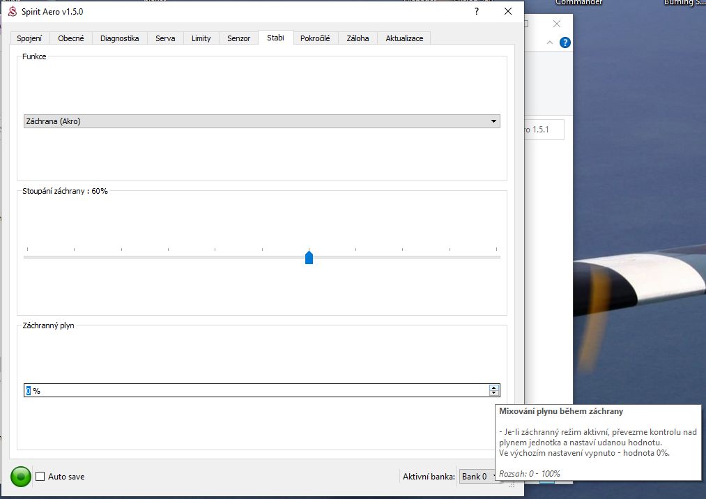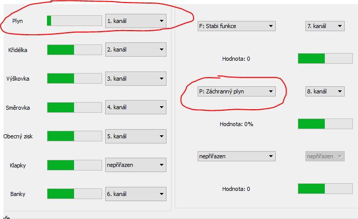 Nevím jak spolu souvisí nastavení plynu v záložce "Stabi" a volby funkce "Záchranného plynu" v "kanálech". Nerozumím tomu. V manuálu jsem to nenašel.