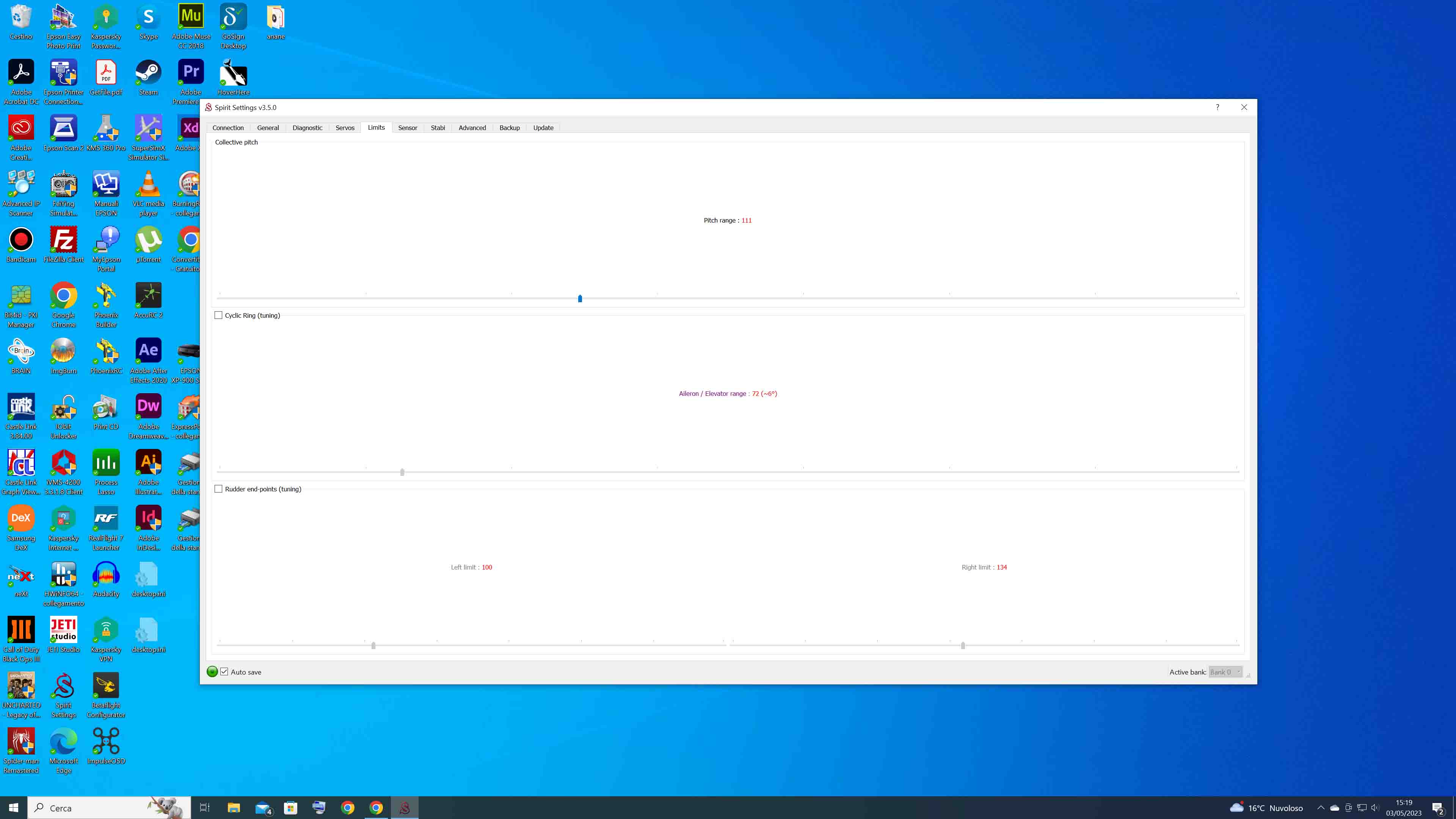 6 precise degrees from the tab LIMITS - CYCLIC RING they don't match exact exact with digital pitch gauge(7degrees for elevator and 8 degrees for aileron) but I mounted a spirit gt on a trex 600 with flybar and there is a difference there too.