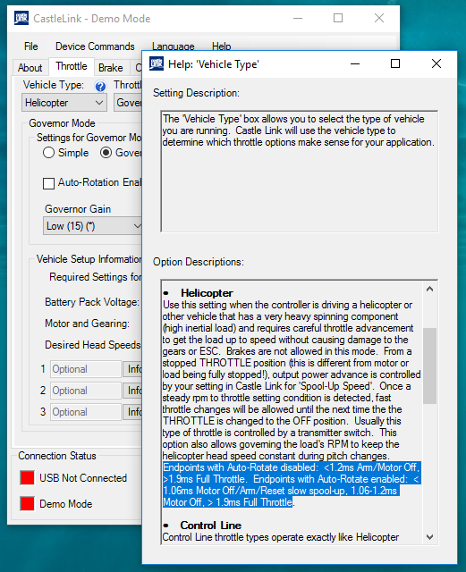 0-100% in diagnostics is good. Then calibrate endpoints for ESC. For Castle, in Spirit bring Max throttle setting down, meaning closer to 1500 us and Min value up, again closer to 1500 us. Then power on with high stick on tx and raise max throttle value in Spirit until you here ESC beep. Bring stick down, now decrease min throttle value in Spirit software slowly until you here the ESC beep again, now it will be a chime indicating that it is armed since low position has been seen by ESC. So... don't use tx endpoints for ESC calibration since that changes 0-100% in diagnostics use Spirit Max-Min setting.ghenders wrote:I know that has been asked countless times before, but I am at wits end trying to setup my Chase 360 with a Edge 50 esc & the Spirit Pro. I have adjusted my DX7s so that in the Diagnostic tab it shows 100% at full throttle and 0% at low throttle. I have then gone into the Governor settings and adjusted the Min & Max throttle to 1200us and 1900us. I then tried to power on with full throttle on the Tx and tried to increase the Tx throttle endpoints higher to get it to arm. What am I doing wrong? I want to use the governor in the ESC NOT the Spirit. I think I am making this harder than it should be!!!!!