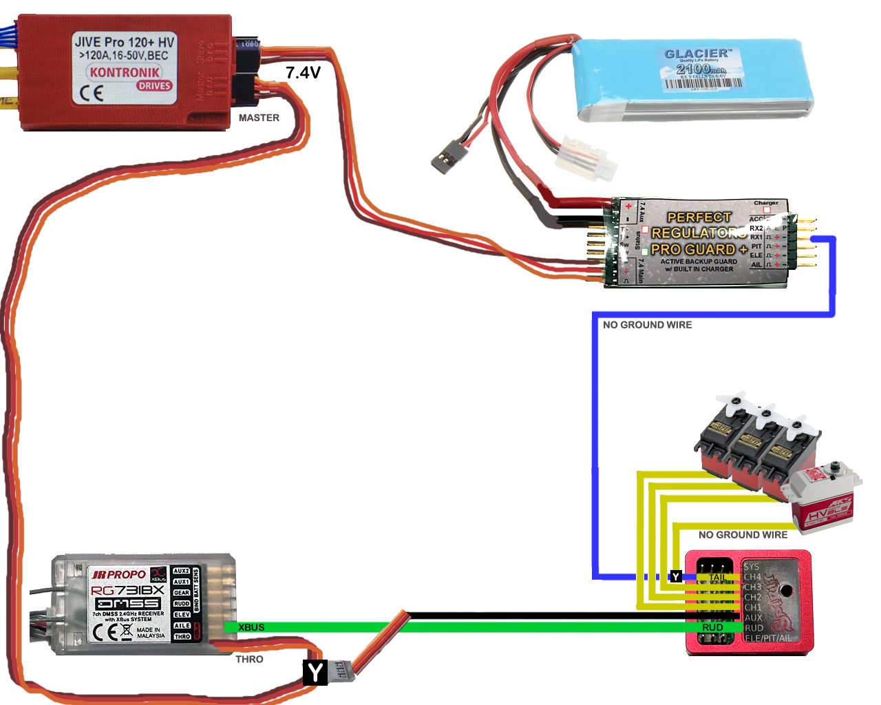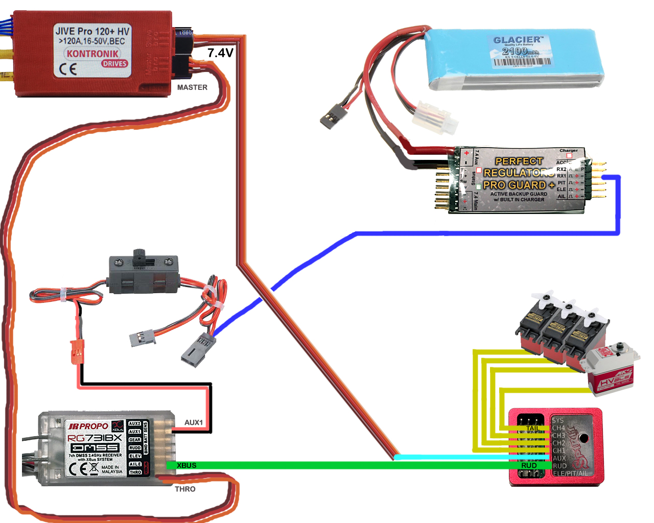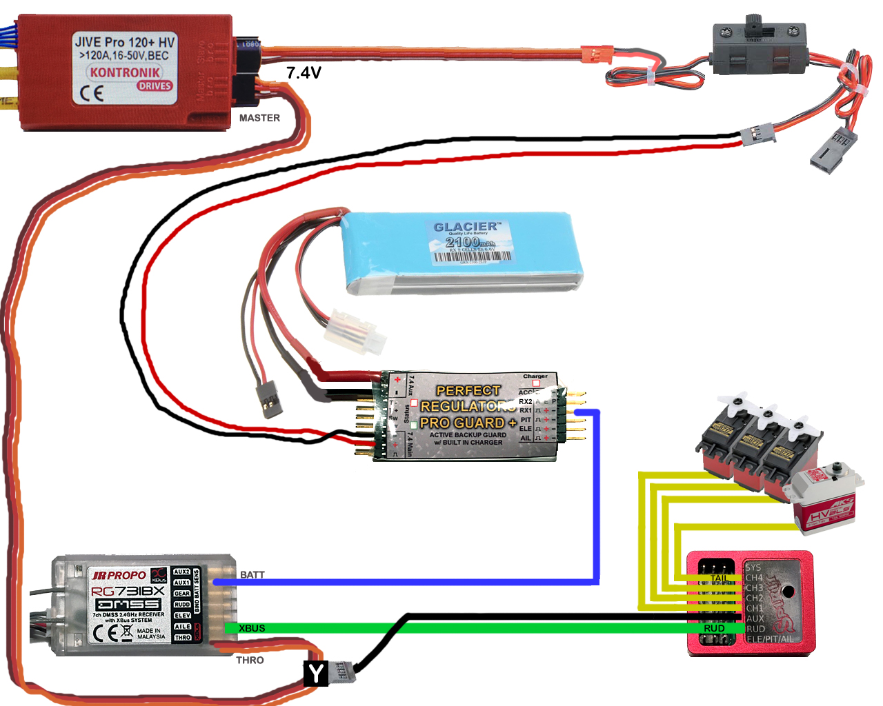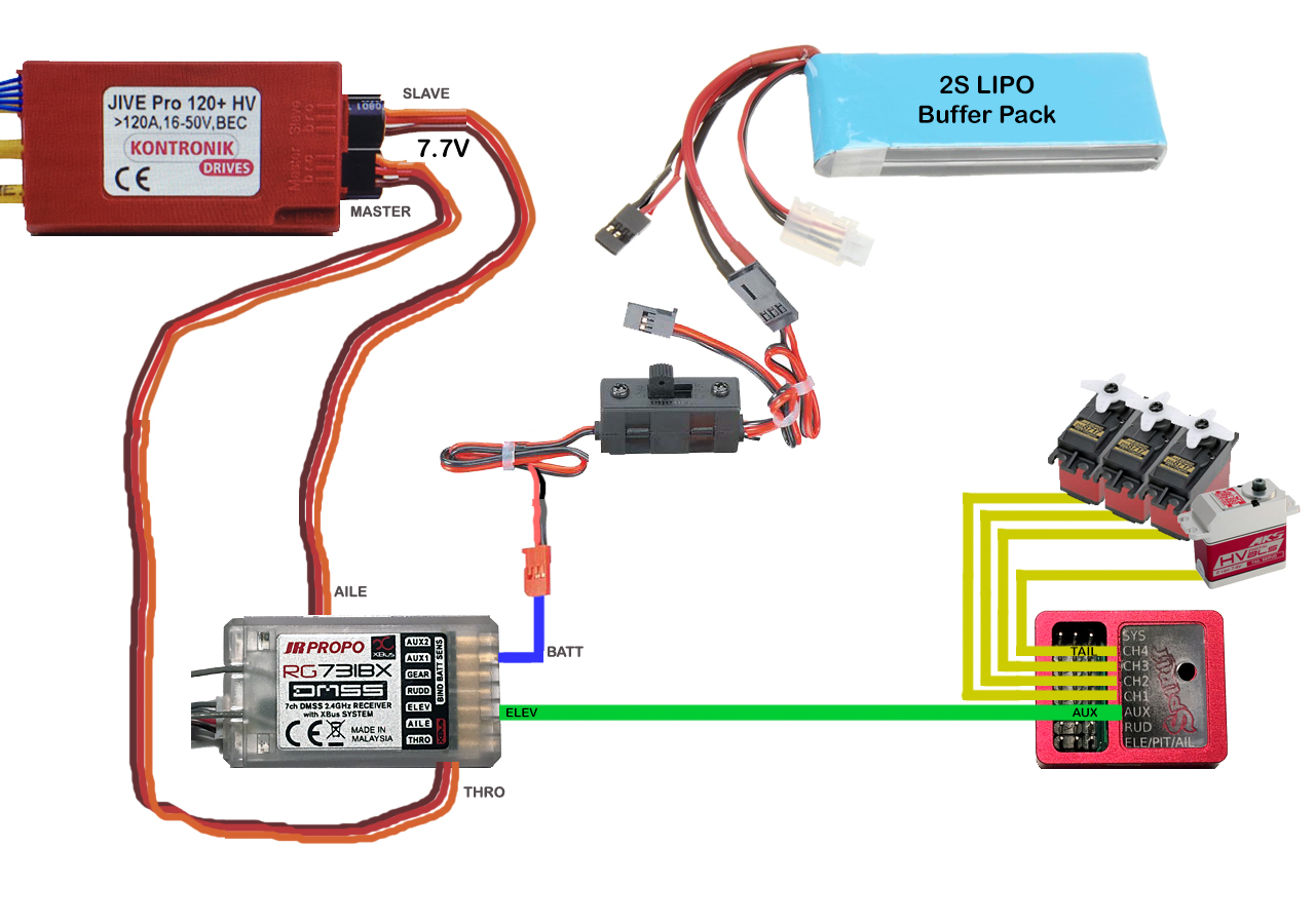 you should take the red wire from the jive master if your using a BEC, no need for the switch in that order since its before the lipo, and the ESC is power from main packs, in other words or you use internal BEC from ESC or use external BEC like the lipo an perfect regulator