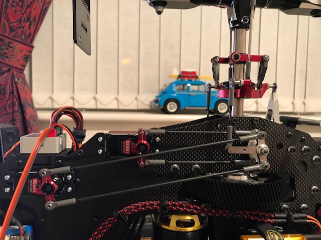 The helicopter is a JR Vibe SGE12 90 sized electric and uses specific JR Alloy servo arms where there is no way of adjusting anything to try to improve this..