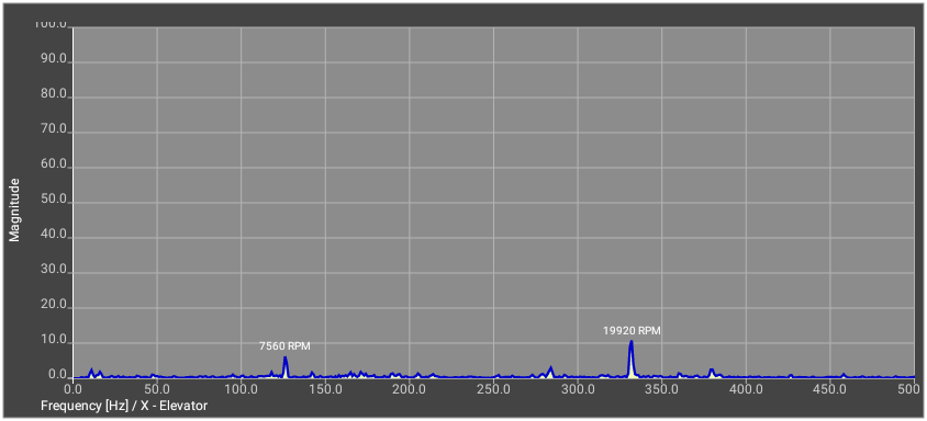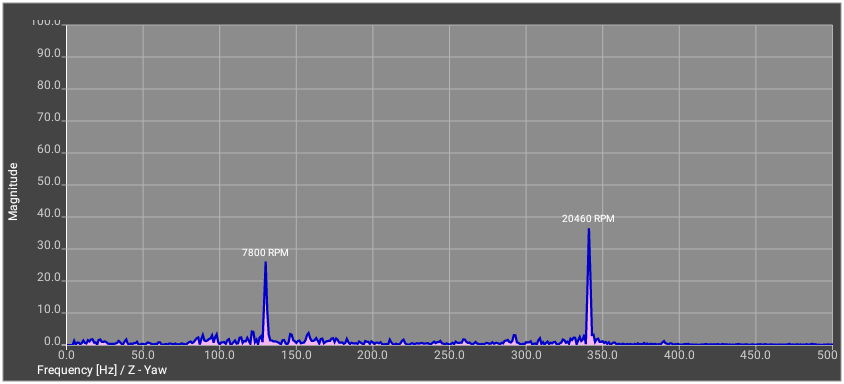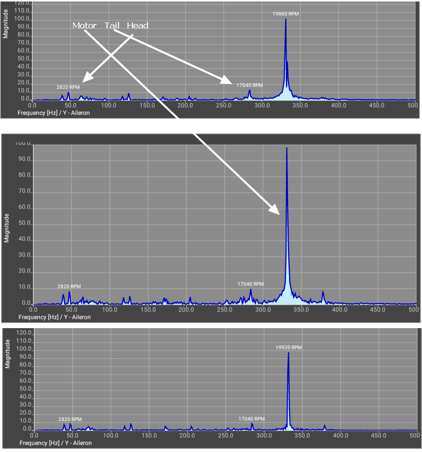 I have tried swapping the tail assemblies, new tail belts, etc. I'm currently setup with a long-boom and 550mm Align CF blades. I removed the blades and did the vibration analysis and saved the plots (see attached). The X and Z snapshot images looked about the same, so I only show one. The Y was more dramatic so all three are shown along with some arrows pointing to items that I think are the motor, tail and head.