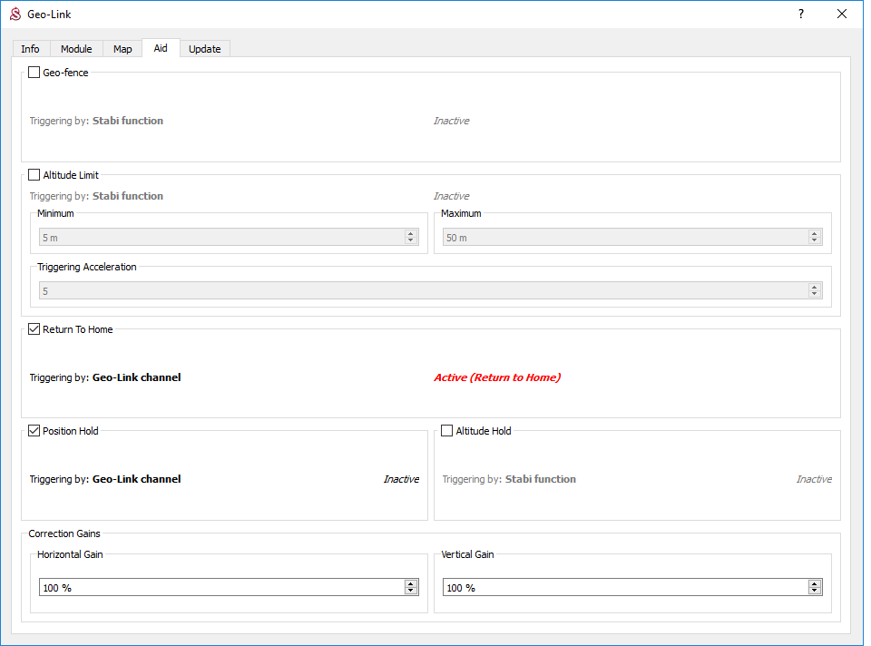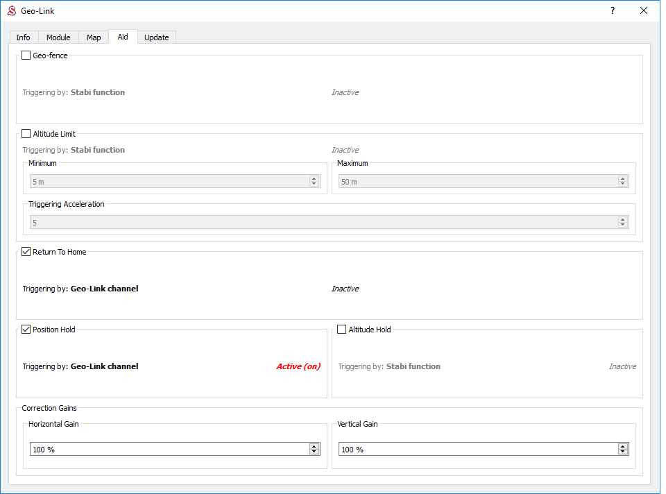 I installed my Geo-Link, performed the Compass Calibration. (Geo-Link displays a solid Blue LED) I am using the Coaxial Stability mode with the Spirit Pro. I have checked the box for the Geo-Link, and i have checked the boxes for Return to home and Position hold in the AID tab under the Geo-Link page. I have assigned the Position Hold and Return to home to Aux1 and Aux2 Respectivly. I have verifed in the channel mapping page that the Switches are functioning with the Spirit Pro. I have also checked that when using position 3 (assign home) switch did in fact change the home from what i had initially set in the software. I am able to view the flight logs in the maps tabs, This also shows a connection with 12 satellites. The problem is that Position hold appears to have no effect what so ever. And when triggering return to home nothing happens. Did i miss something, or is there something wrong?