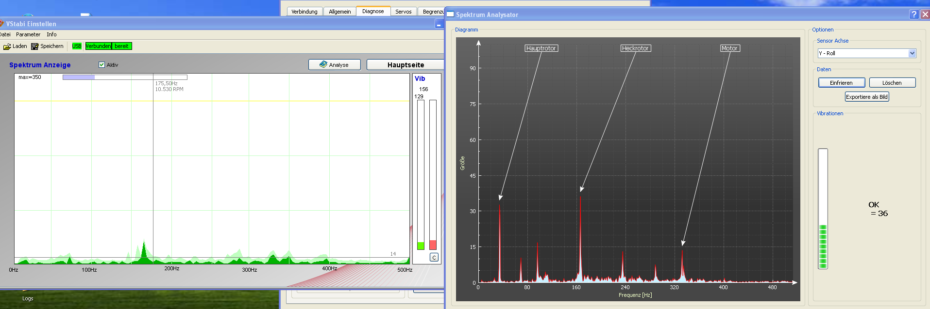 I disassembled the heli and actually like to handle the mainrotor vibrations. Also I attached a Vbar Blueline for comparison (I am using this more in the past and have better understanding how it works). After exchanging some components the Vbar has a constant reading and the Spirit goes up and down, you can see in the movie. This is without head and tail.