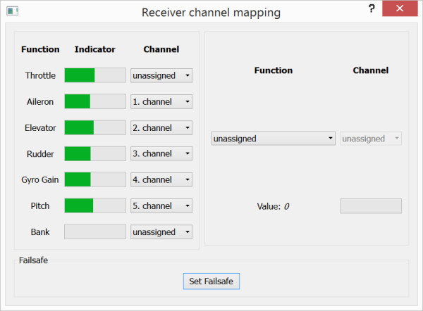 On the transmitter all mixers are disabled, and all channels output a linear (-100..+100%) signal. I checked with the transmitter integrated servo monitor. But on the Spirit side, channel readings are a bit weird. TX channel 4 seems to be skipped, TX channel 5 is mapped on spirit channel 4, TX channel 6 is mapped on Spirit channel 6. Elevator (collective) is reversed with very limited range is 118..0%, Pitch channel is reversed with limited range 118..-68%, see table bellow