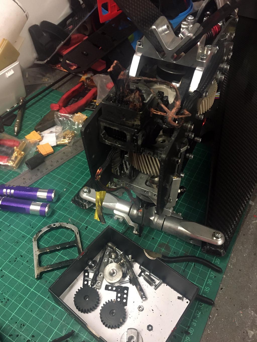 It was the 450mAh backup pack that 'went up' and damage was limited to the front of the heli, which unfortunately is where all the electronics are on the TDR2. The Spirit Pro got it pretty bad: Amazingly once I cleaned it up and removed the melted plugs my Spirit Pro is working fine!, the metal case did an amazing job of protecting the internals. A plastic case FBL would have been a black blob of carbon!