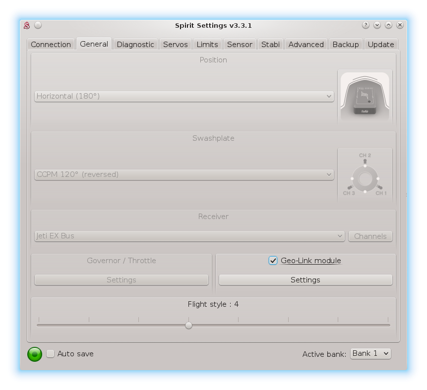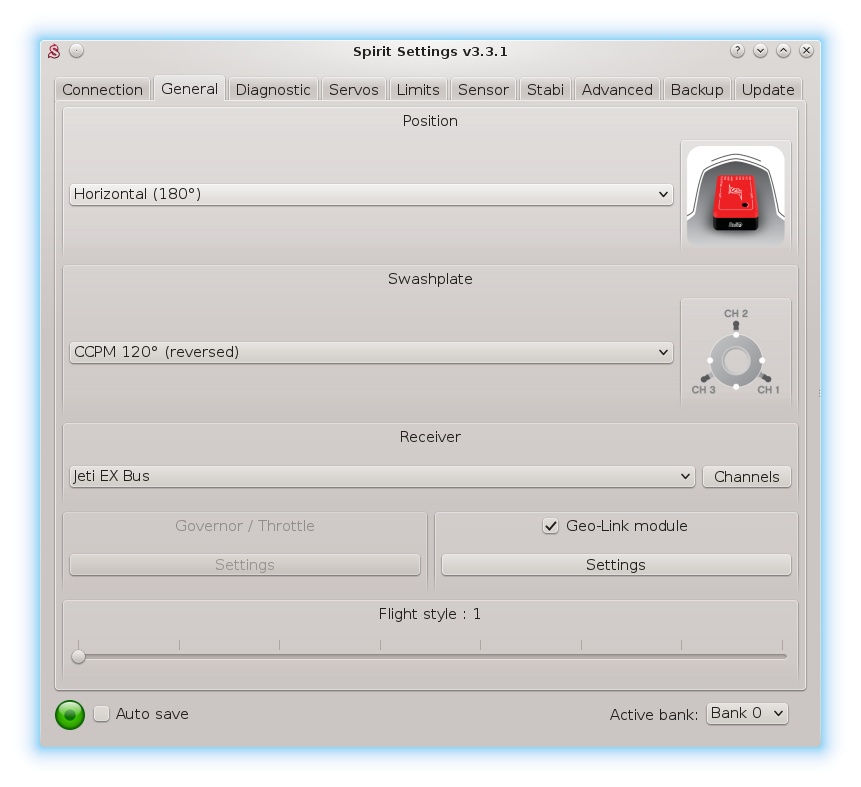 Hi, yesterday I do some Testflights I observed that the Heli without GeoLink the function “Automatic Rescue” when he Rescue the Heli the duration time is too short maybe half second, I was trying to compensate this with more Pitch , but the Tail cannot compensate the Torque. Also where I can adjust that the Rescue time for at least 1 Second, I don’t found nothing in the software. Also the electronic not compensate the level of the Heli.