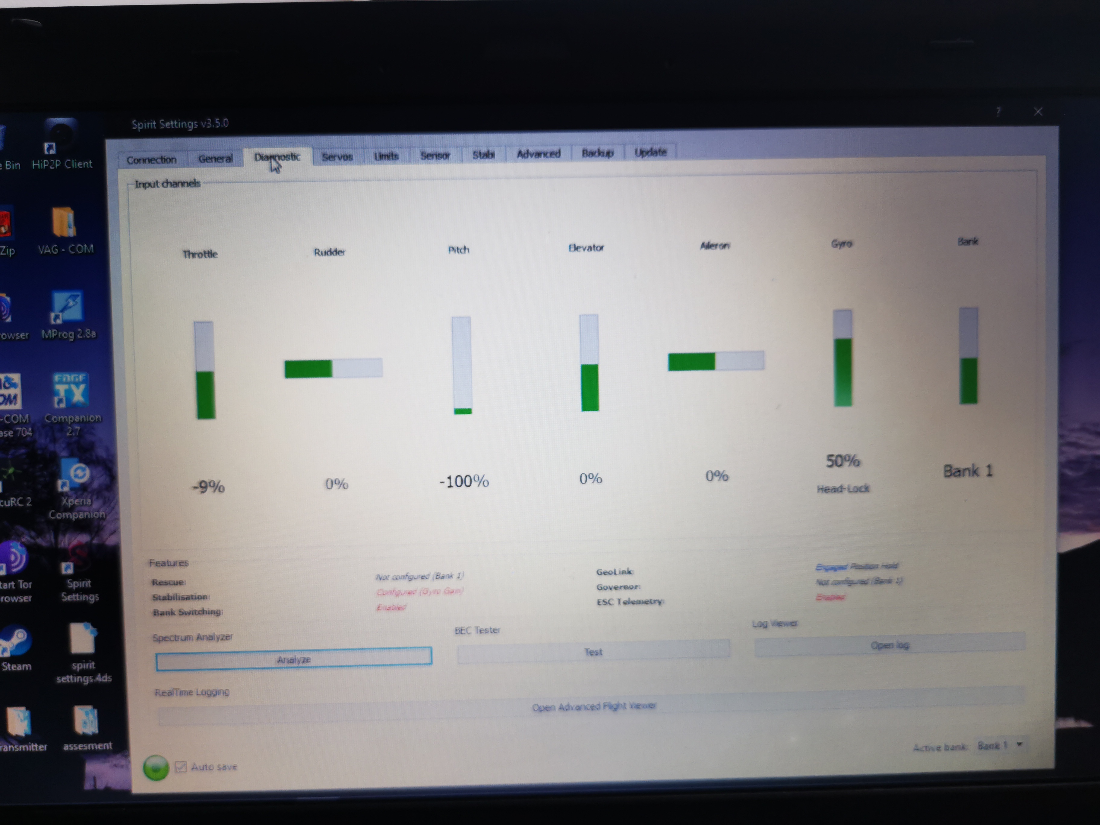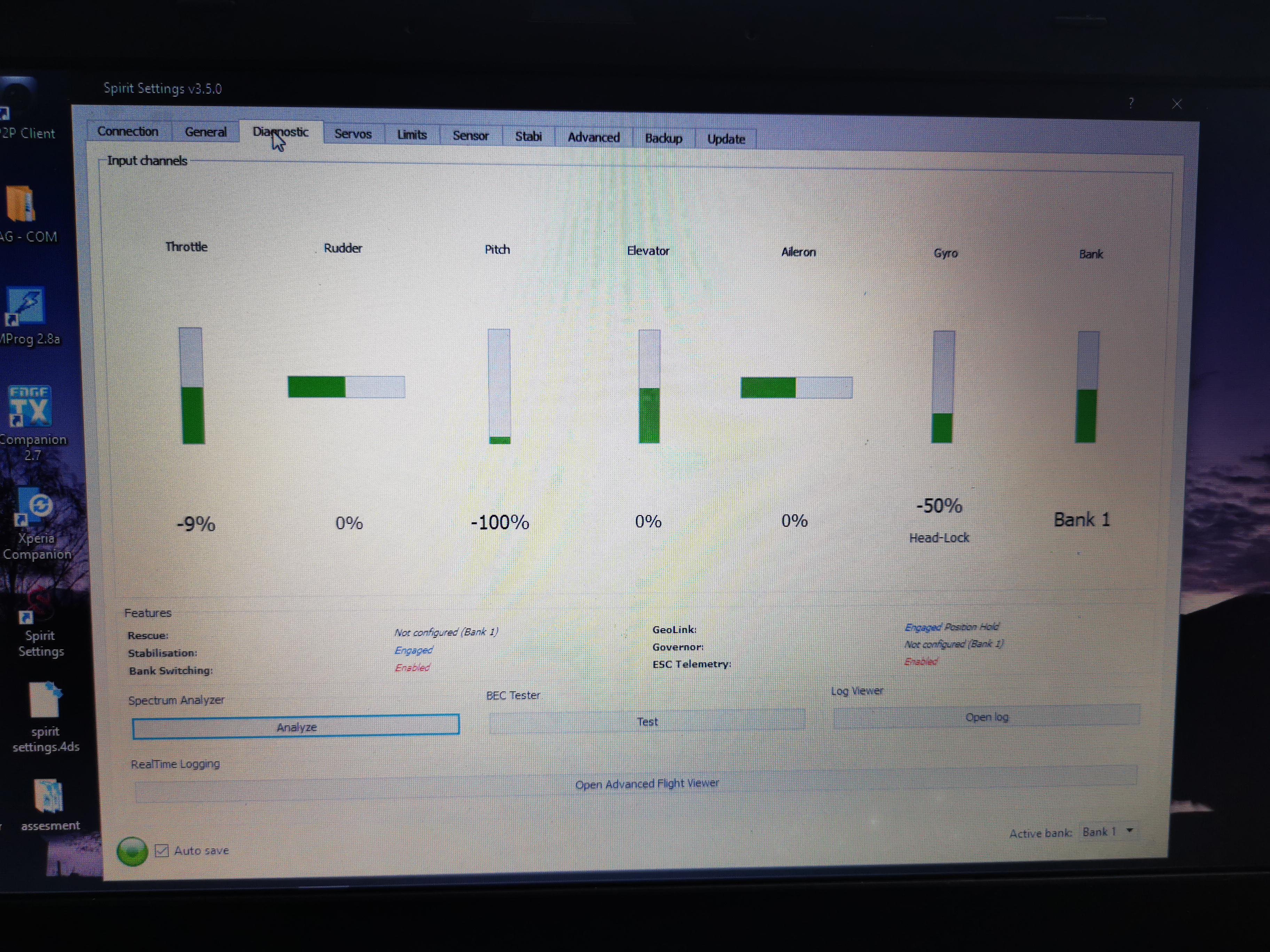 Everything looks good in diagnosing tab i had a small hover in bank.1 and 2 but while adjusting gyro found it acting a bit like flybared.