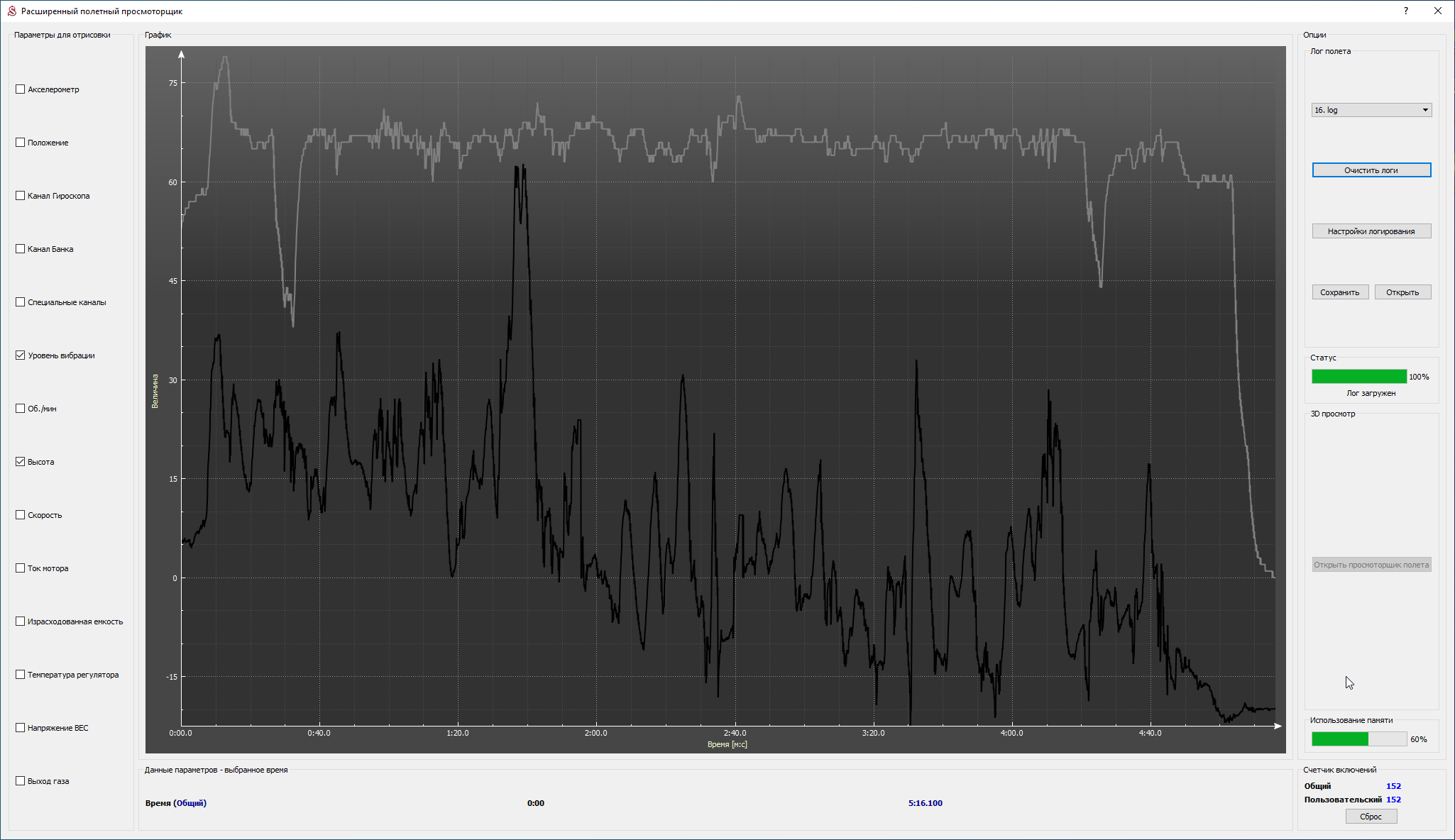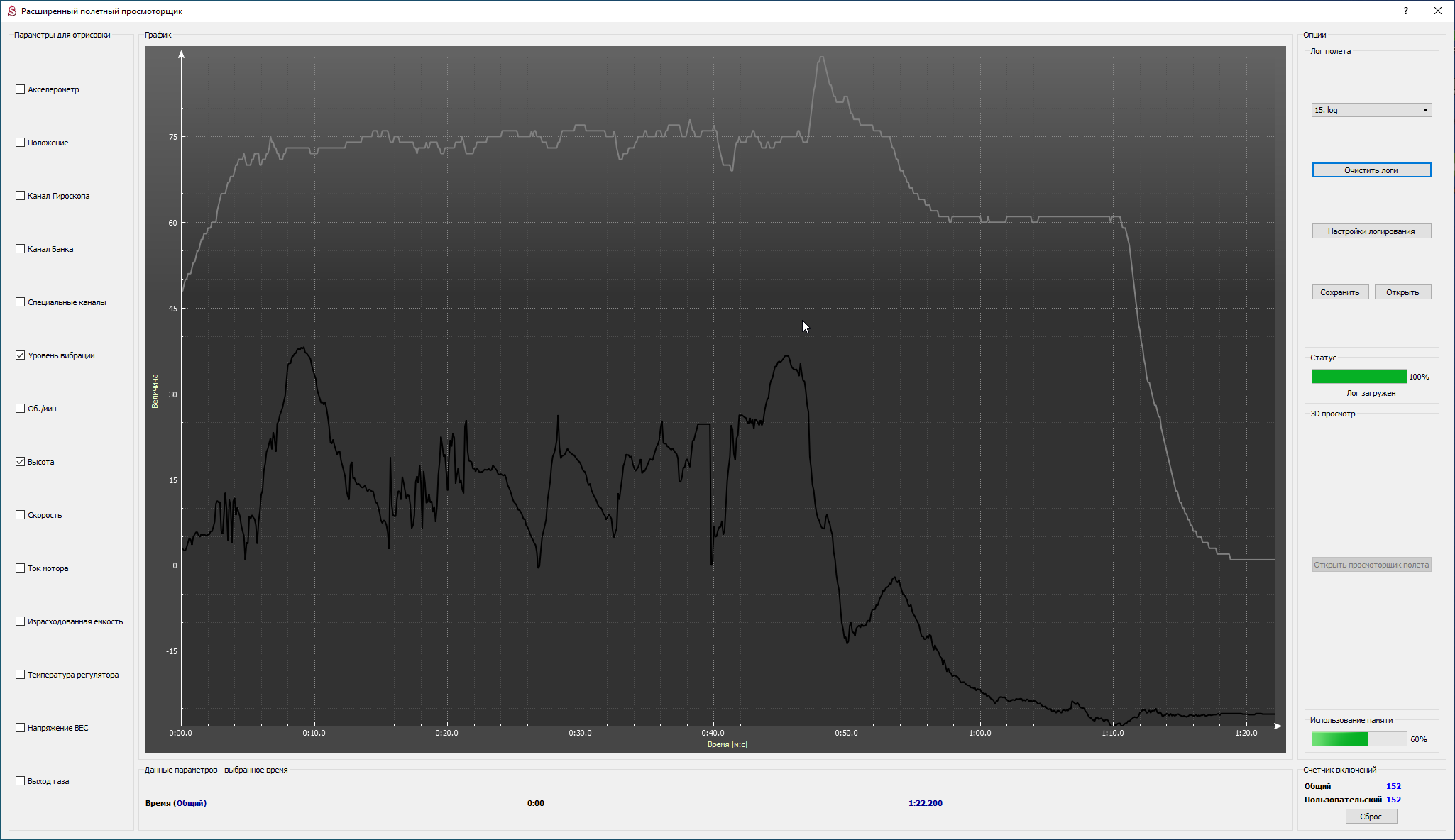 2. I attach screenshots of the vibration graph of two flights below. The black graph is the altitude, the gray one is the vibration level.