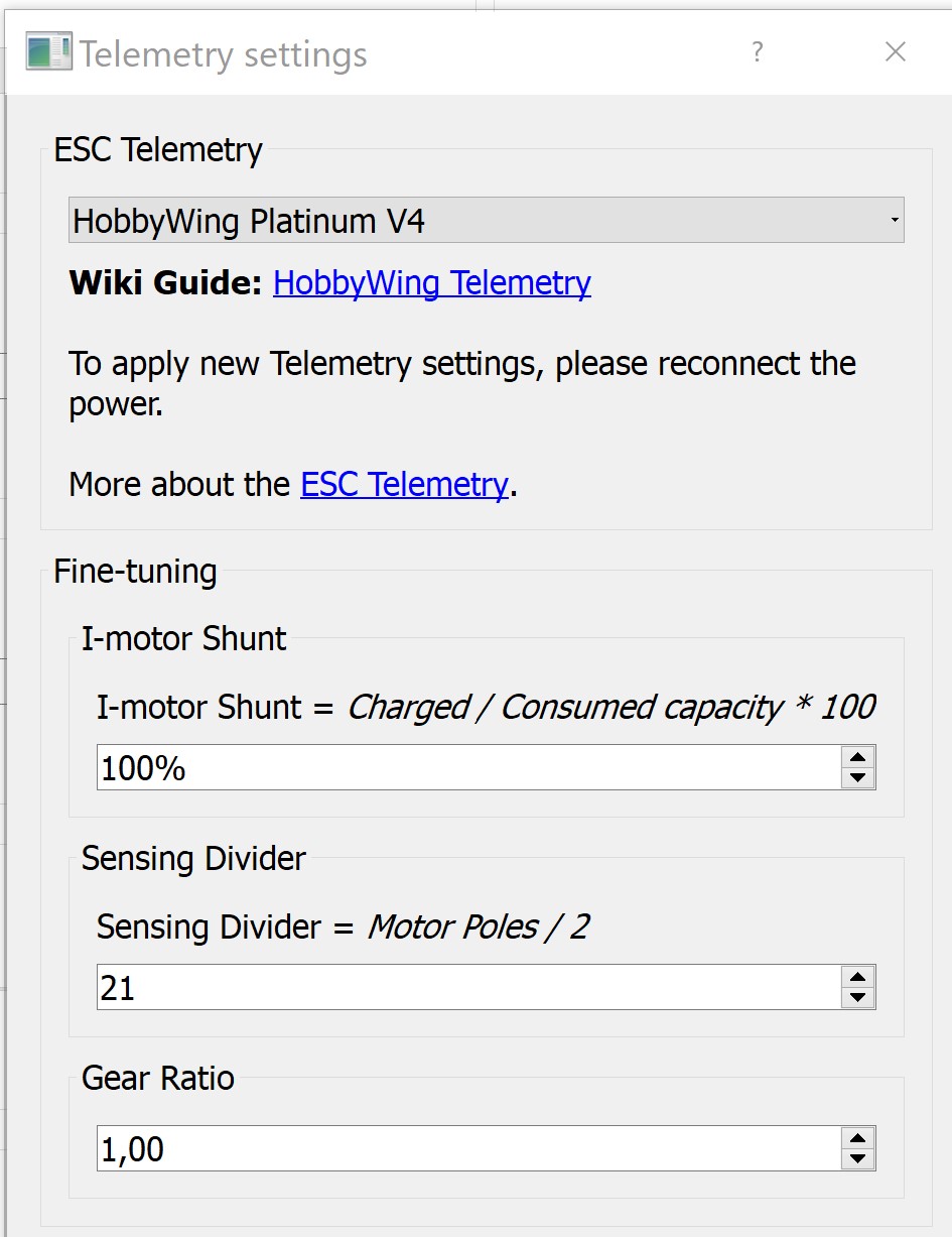 My question relates to the telemetry settings. I have a Hobbywing V4 installed and wired such that i get RPM back on my Jeti DC24.